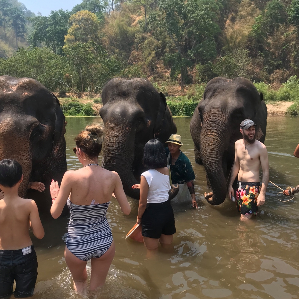 มาถึงทีเด็ด การอาบน้ำจ๊าง เรารีบวิ่งไปแย่งแปรงขัดพื้นและถังวิ่งตรงไปที่เจ้บุญศรีและเหล่าเพื่อนช้าง บอกเลยว่าโอ้โหเหม็นดี ฮ่าาาา แต่ก็ไม่ได้เลวร้ายอะไร เราใช้แปรงขัดงวงช้างแล้วรดน้ำให้มัน ฝรั่งชอบช้างไทยเราเอามากมากเลย รู้สึกภูมิใจในบ้านเกิดที่มีช้างเยอะขนาดนี้ เอ้อเราถามควาญด้วย ทำไมไม่มีสบู่ให้ช้าง เขาบอกว่าช้างแพ้นะ อาบแค่น้ำก็ได้แล้ว อ๋อออออองี้นี้เอง