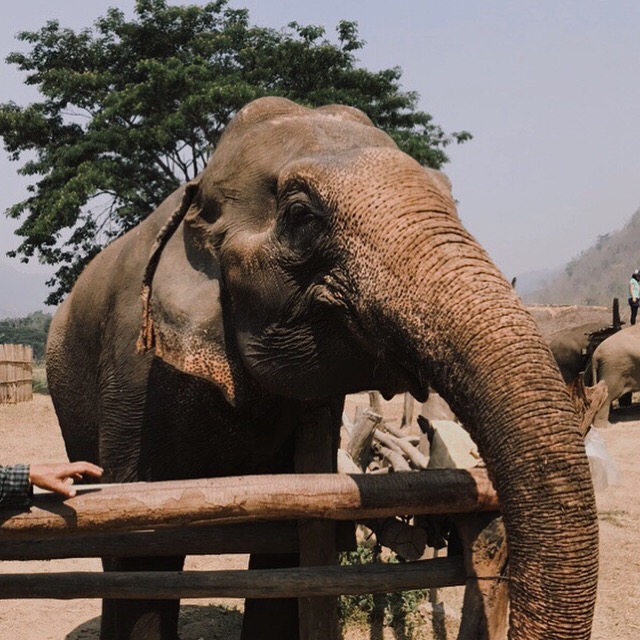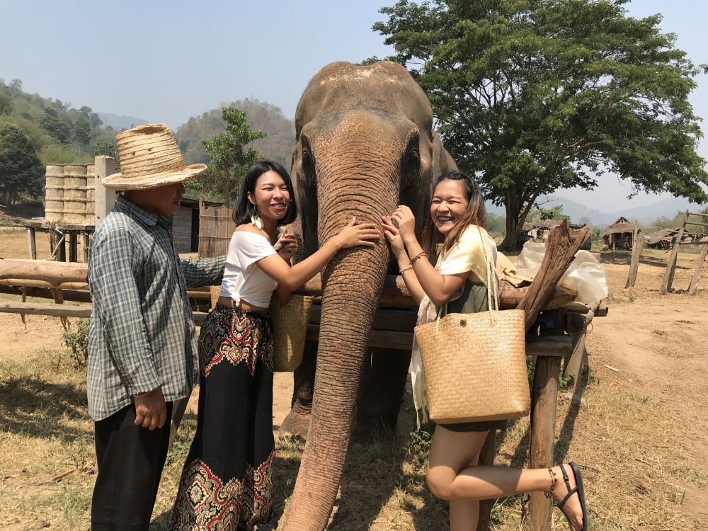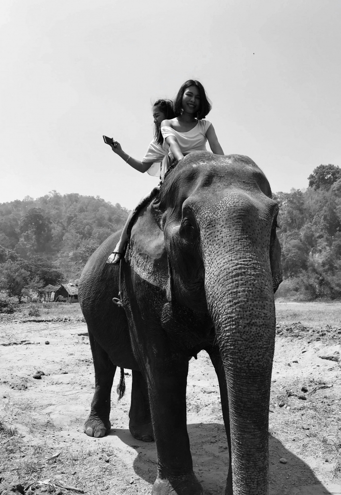 เราชวนเพื่อนไปขี่เจ้บุญศรี เพื่อนก็กล้ากล้ากลัวกลัว เราบอกมาเถอะมึงไหนไหนก็มาแล้ว ลู้ยยยยยย! ทันที่ที่กูผู้ที่อยากขี่ช้างมาก ย่างเท้าขึ้นบนหลังเจ้บุญศรี บอกเลยว่า ขาเริ่มสั่น เริ่มกลัวตายชห. ด้วยขนที่หนาและแข็งทิ่มชั้นเจ็บมั่กก และประเด็นคือเราอาสานั่งหน้าด้วยต้องเอาเท้าไปแอบไว้ตรงหูทั้งสองข้างช้าง ไม่มีที่จับไม่มีอะไรเซฟจ้าา ทำเหมือนชั้นขี่ช้างไปโรงเรียนทุกวันงี้* เรียลอะมึงมันเรียลมากมีแต่ช้างกับพวกเราสองคน เพื่อนนั่งหลังเราเหมือนจะมีเชือกให้คอยจับ แต่เราบอกนางว่า มึง เกาะเอวกุเถอะกุไม่มีไรเกาะเล้ยย แล้วลองคิดตามนะ เราเอามือทั้งสองไปขนาบไว้บนหัวช้างแบบแทบจิก ขาหนีบหูช้างไว้ขนทิ่มแทงขาชั้นมากจ้าา กลัว หนูกลัวตกช้างก็ตอนที่มันเริ่มเดินนี่แหละ เราอยู่ตรงเท้าหน้าช้างอ่ะ เวลามันเดินก็จะดึ๋งดึ๋งตามจังหวะเท้าแล้วคือกุต้องพยายามโยกตามช้าง บางทีมันหยุดหาของกินกลางทางแก กุแทบร่วง นี่ได้แต่คิดว่าถ้าพ่อรู้ว่ากุตกช้างพ่อตีกุตายแน่แน่ /ผ่านไปซักห้านาทีเริ่มชินละ แดดและลมปะทะหน้า ความอุ่นใจเริ่มเข้ามาแทนที่ความกลัวตาย ชั้นขี่จ๊างเป็นแล้วเว้ยยยย เริ่มรู้จังหวะ เริ่มแหกปากโม้ ร้องเพลงบ้าบ้าบอบอ ควาญก็ชวนคุยด้วยนะ เออควาญคุยภาษาช้างด้วย เค้าดูรักกันน่ารักกกก
