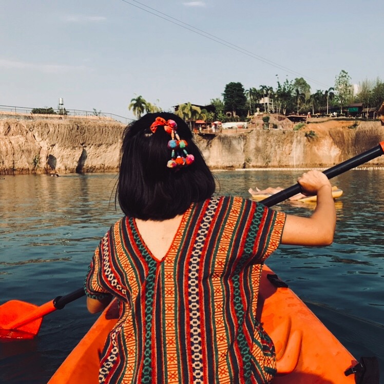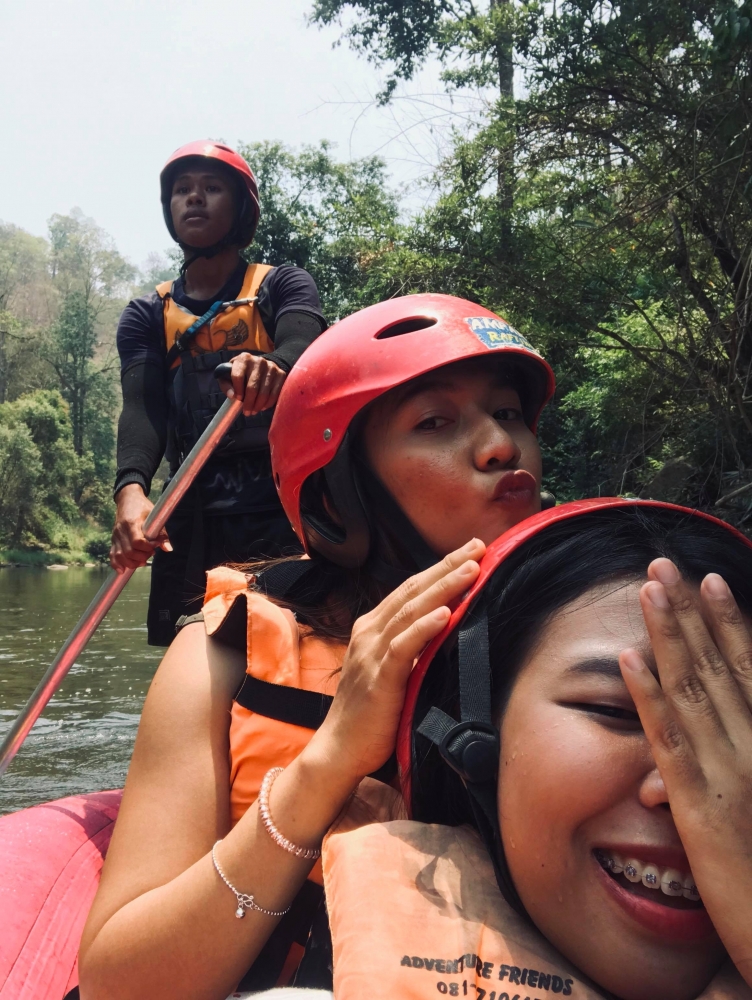 เปลี่ยนชุด เตรียมล่องเรือกัน ถึงน้ำจะน้อยเพราะเป็นช่วงฤดูร้อน แต่น้ำตามแก่งก็ยังเชี่ยวมากก และมันส์มากตรงน้ำเชี่ยวนี่แหละ เรือเกือบคว่ำหลายรอบดีนะน้องคนพายเรือเก่ง ทักษะน้องเค้าดีมากก หลังล่องแก่งเสร็จก็ทานข้าวเที่ยวกัน เป็นข้าวผัดกับผลไม้ฉ่ำฉ่ำ /เรานั่งทานข้าวกับครอบครัวชาวชิลีแม่ลูก เราดีใจมากกที่ได้คุยอิ้งกับชาวต่างชาติ ในทักษะอังกฤษอินี่ชอบ การพูดมากสุดอะ เลยจัดเม้ากันทุกเรื่อง และได้พบว่า ความฝันของแม่ชาวชิลีคือ การได้ขี่ช้างไทย ว้าววมันทำให้เราคิดได้ว่า ทุกคนที่ออกมาเที่ยวอะเขามีความฝันและมีเป้าหมายหลักคือสิ่งใดสิ่งหนึ่ง แล้วเขาก็สานฝันมันโดยการลงมือทำ ลงมือเที่ยว มันเจ๋งมาก!ที่คุณกล้าสานฝันตัวเองให้สำเร็จโดยการบินข้ามน้ำข้ามทะเลจากอเมริกามาเมืองไทย ก่อนจบบทสนทนาแล้วต่างทานข้าวกัน เราบอกเค้าว่า ขอให้มิสชั่นคอมพลีทนะคะ