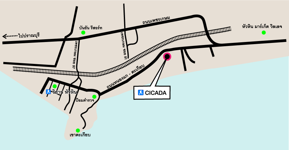 โครงการซิเคด้ามาร์เก็ต (Cicada Market) หรือ ตลาดนัดจั๊กจั่น ตั้งอยู่ที่ เดอะเวนิวแอทสวนศรีเขาตะเกียบ หัวหินจังหวัดประจวบคีรีขันธ์ จากหัวหินใช้เส้นทางถนนเพชรเกษมถึงแยกหัวหินหนองแก - เขาตะเกียบ ตรงมาทางเขาตะเกียบประมาณ 700 เมตร ซิคาด้ามาร์เก็ตจะอยู่ทางด้านซ้ายมือ ที่บริเวณฝั่งตรงข้ามเป็นที่จอดรถของโครงการ ซึ่งจอดได้ฟรีถ้าที่จอดรถเต็ม ก็สามารถจอดได้ที่ซอยข้างๆ ทั้งซ้ายและขวาของสวนศรีหรือริมถนน