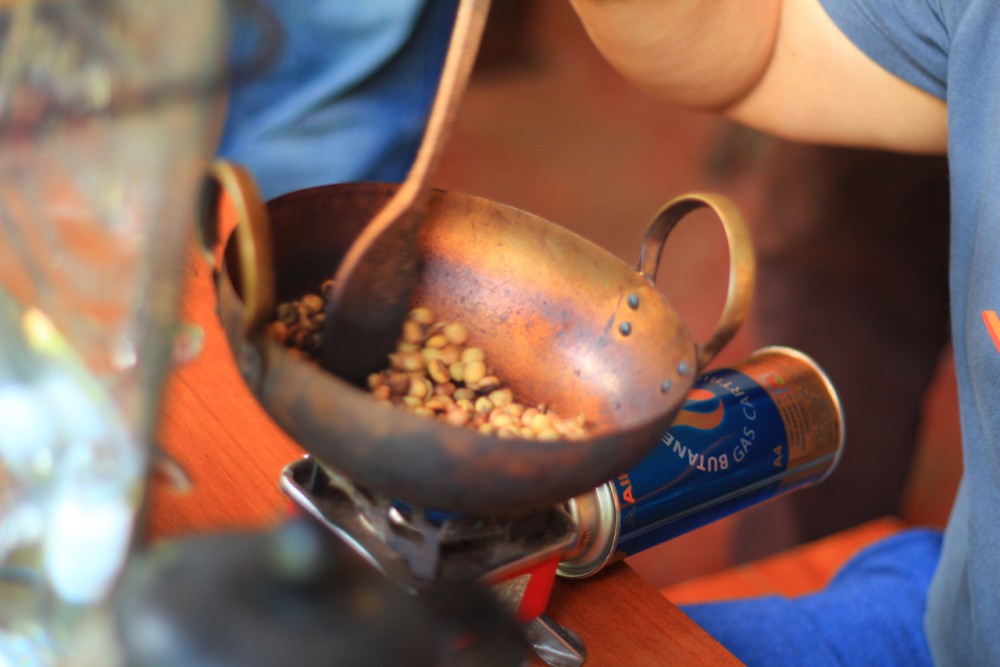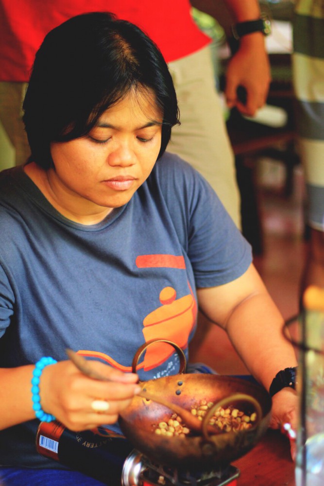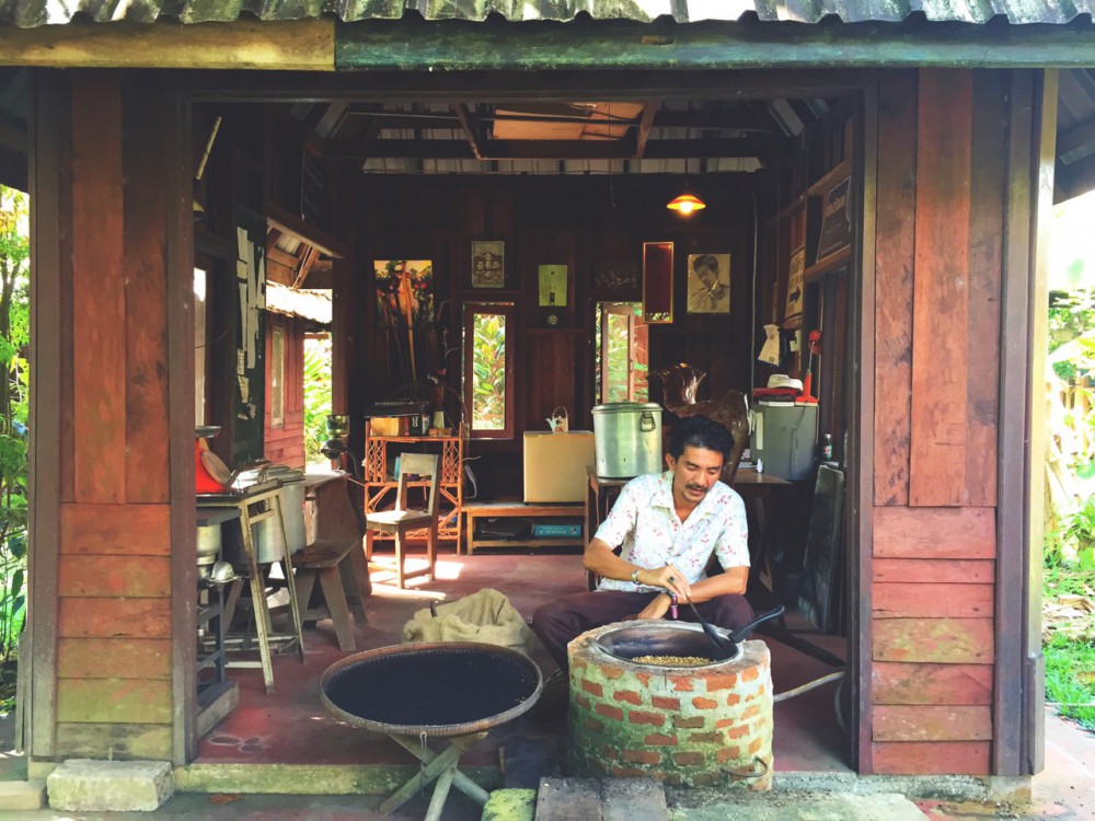 ไม่ใช่แค่การเล่าที่มาที่ไปของกาแฟ แต่พี่ก้องเค้าใจดีให้พวกเราได้ลองคั่วกาแฟเอง บดกาแฟเอง ชงกาแฟเองด้วยตัวของเราเอง มันสนุกตรงนี้แหละ!! อีกทั้งพี่ก้องยังคั่วเมล็ดกาแฟให้เราดูด้วย เคล็ดลับและจุดเด่นของกาแฟพี่ก้องอยู่ตรงที่ >>> พี่ก้องคั่วกาแฟด้วยมือมีกะทะ และไม้พายที่ทำจากต้นอบเชยต้นไม้ท้องภถิ่นของจังหวัดระนอง เป็นอุปกรณ์สำคัญ อีกทั้งเป็นสัญลักษณ์ประจำตัวก้องวัลเลย์