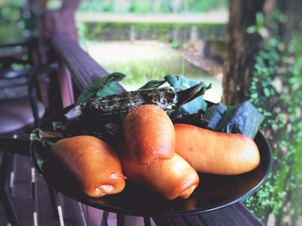 เช้าตรู่แบบนี้กินซาลาเปาทอดฝีมือคุณแม่พี่ก้องรองท้องก่อนออกเที่ยวสักหน่อย ซึ่งบริเวรร้านอาหารมีธารน้ำเล็กๆไหลผ่าน สามารถลงมาเล่นน้ำได้ค่ะ
