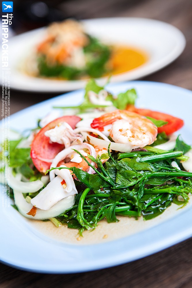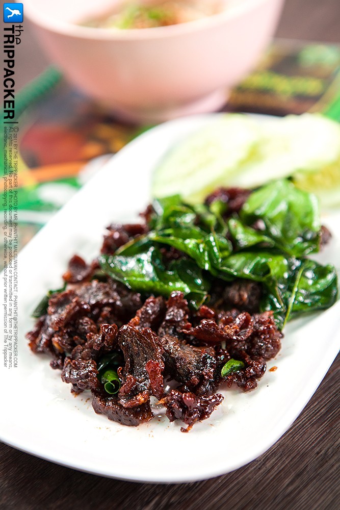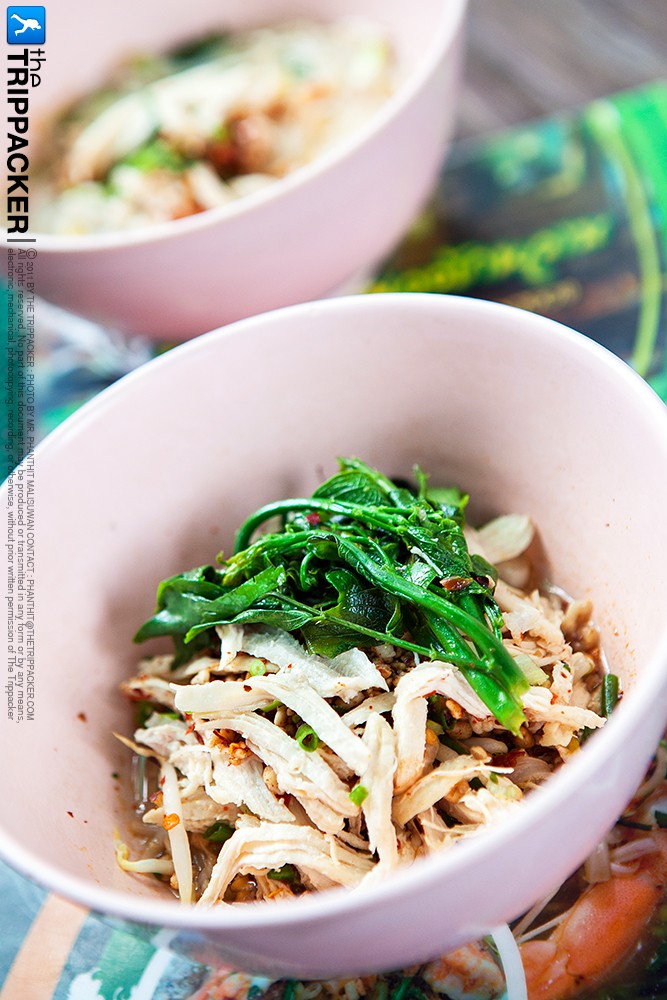 แค่เดินเข้ามาในบริเวณร้าน เราก็สัมผัสได้ถึงบรรยากาศอันร่มรื่นเพราะทั่วทั้งบริเวณร้านถูกประดับประดาไปด้วยต้นไม้น้อยใหญ่เป็นจำนวนมาก จนแทบจะเรียกว่าเป็นสวนอาหารขนาดย่อมๆ ก็คงจะไม่ผิดนัก และนอกจากที่นั่งในโซนสวนด้านหน้าร้านแล้ว ทางร้านยังมีห้องแอร์เย็นฉ่ำไว้ให้บริการอีกสองห้องด้วยกัน จัดว่าเป็นร้านก๋วยเตี๋ยวที่ค่อนข้างใหญ่เลยทีเดียว เพราะดูจากจำนวนโต๊ะแล้วคงสามารถรองรับลูกค้าได้เป็นจำนวนมาก ยิ่งในช่วงเที่ยงๆ ลูกค้าก็ยิ่งแน่นร้านจนบางทีอาจจะต้องรอคิวโต๊ะกันซักหน่อย พอเลือกที่นั่งมุมเหมาะๆ ได้แล้ว เราตัดสินใจไว้ว่า หลังจากสั่งอาหารเสร็จจะขอเดินชมให้ทั่วร้านสักหน่อย แต่ยังไม่ทันได้ขยับตัวไปไหน พนักงานก็เริ่มนำอาหารมาเสิร์ฟเสียแล้ว
