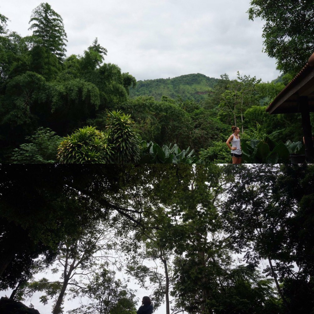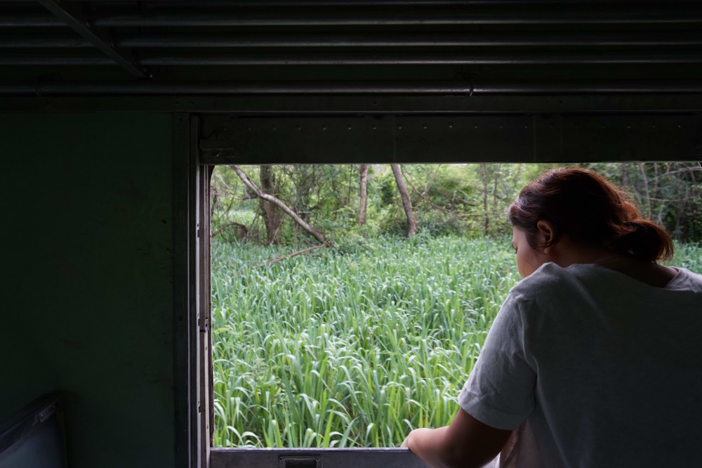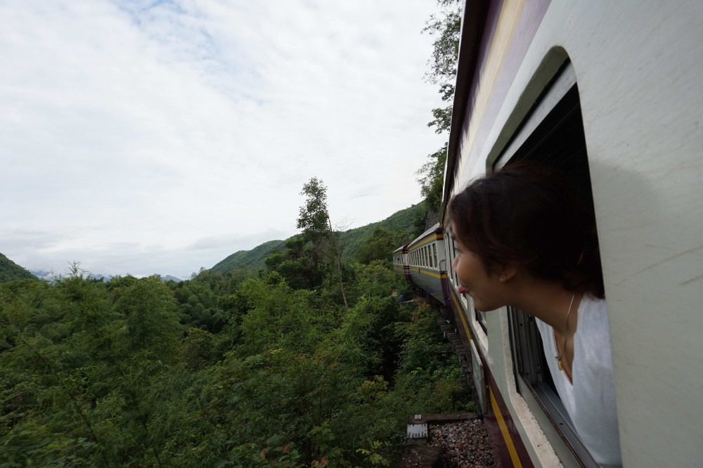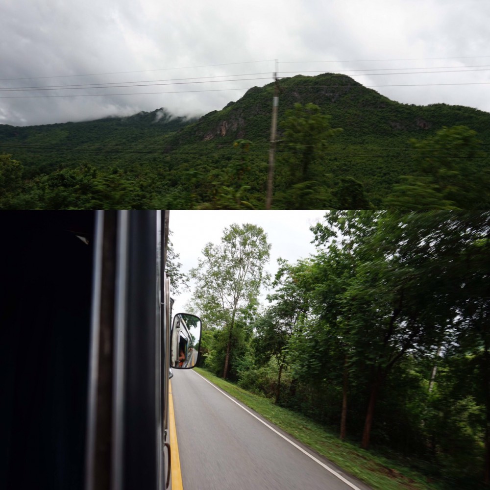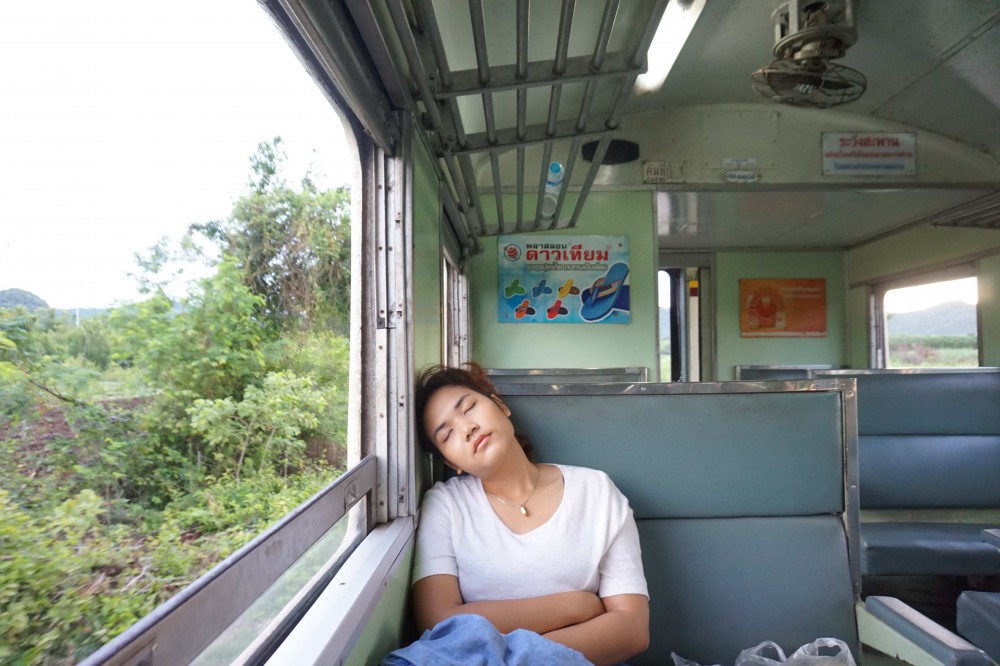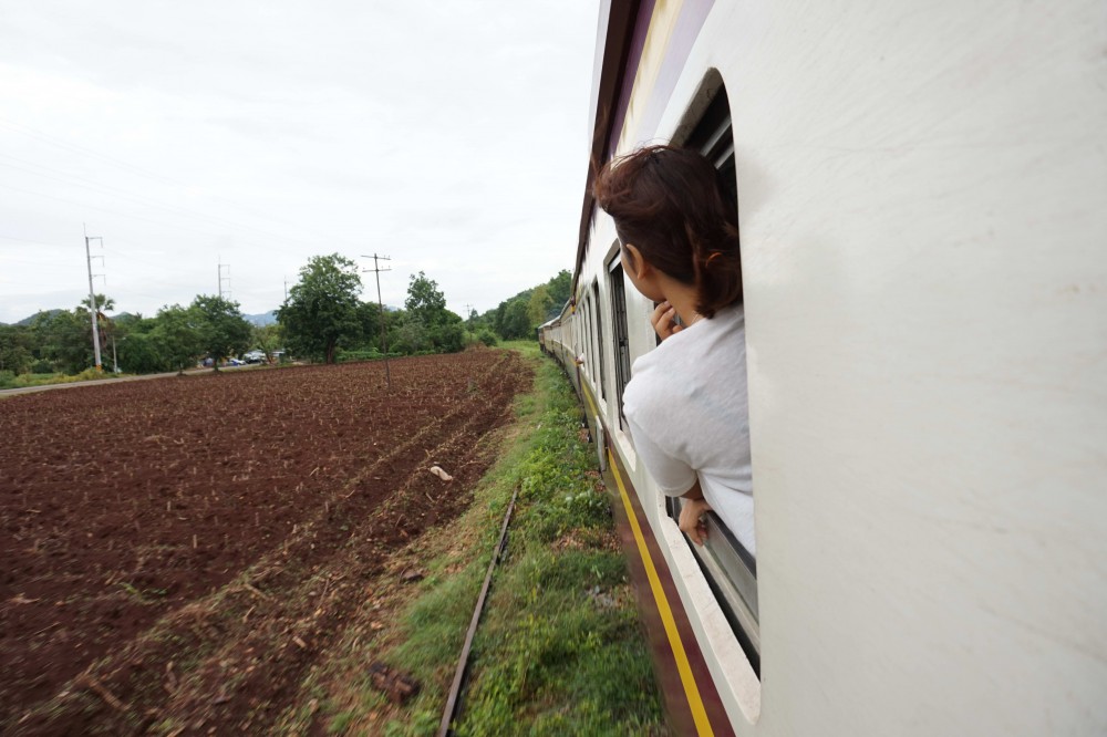 วิวข้างทางหลังจากออกสถานีสะพานข้ามแม่น้ำแคว เหมือนฝนตกไปเมื่อคืน อากาศเลยเย็นสบายสำหรับการนั่งรถไฟ  เลยทำให้เพื่อนสาวผู้น่ารักสงบเงียบไปตามระเบียบ จริงๆแล้วแค่มาเปลี่ยนที่กินที่นอนเฉยๆ 5555555555