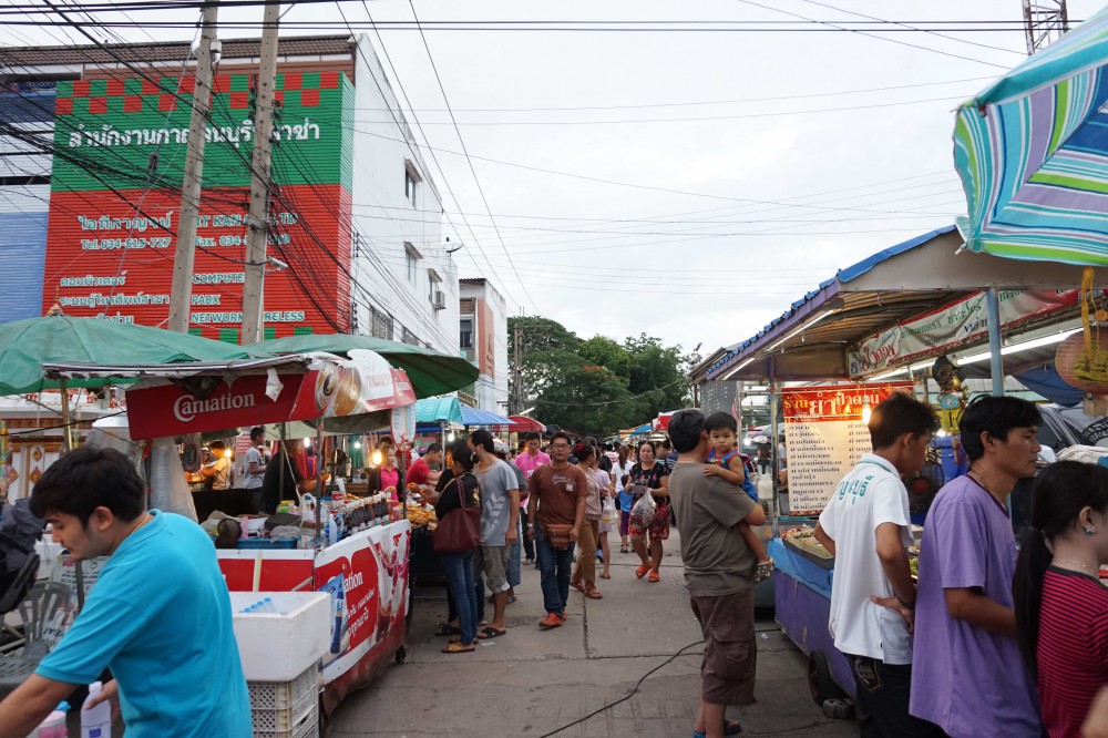 ถึงในเมืองประมาณหกโมง ลงที่หน้าที่พักเลยเพราะรถวิ่งผ่านกลางเมือง เช่าจักรยานจากที่พักร้อยนึง ตอนแรกป้าก็บอกว่านั่งวินซิ คือเราจะไปสะพานแล้วจะกลับมาที่สถานีรถไฟ ไปตลาดข้างๆสถานี คนที่นี้เรียก เจเจ เปิดทุกวัน