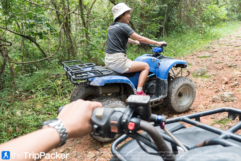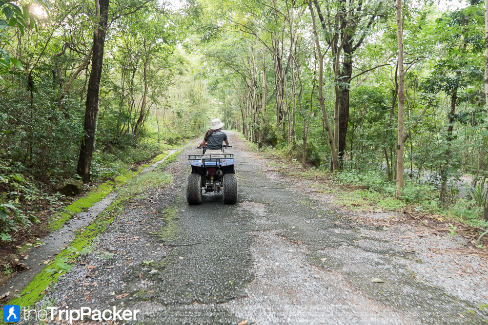 ใกล้เย็นก็จะมีนักท่องเที่ยวเพิ่มขึ้นเรื่อยๆ ทั้งเด็ก ชาวต่างชาติ และกลุ่มวัยรุ่น ทำให้การแช่น้ำของเราไม่สะดวกซักเท่าไหร่ เราเลยหากิจกรรมสุดท้ายเป็นการปิดท้ายทริปให้ลงตัว เพิ่มความตื่นเต้น และทดสอบความแข็งแรงของกล้ามเนื้อ นั่นคือการขี่ ATV ขึ้น เขาหล่น โดยปกติแล้วส่วนใหญ่จะขี่กันรอบ ๆ ด้านล่างไม่แอดเวนเจอร์มาก แต่เราเลือกที่จะขี่ขึ้นไปด้านบนเพื่อไปยังจุดชมวิวที่สวยงามบนเขาหล่น ระยะทางรวมทั้งสิ้น 7 กิโลเมตร ทั้งขี่ขึ้นเขา ลงห้วย ปีนหิน เรียกว่าความลุยมาครบ
