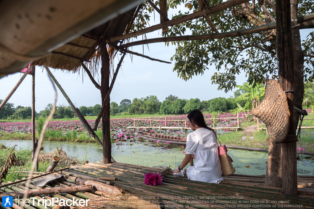 ถ่ายรูปเล่นสักพัก ก็ได้ยินเสียงจากชาวบ้านว่า "วันนี้มีขนมที่ทำจากสายบัวมาขายด้วยนะจ้ะ" เรื่องของกินไม่มีพลาด จัดมาสักกล่อง แถมอุดหนุนบัวแดงที่ชาวบ้านเก็บ และมัดเป็นกำ มาไว้เป็นพร็อพสำหรับถ่ายรูปอีกซักหน่อย