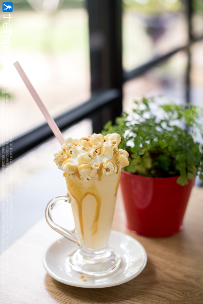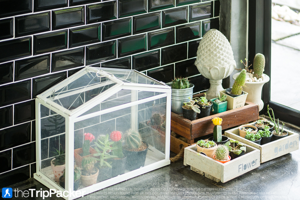 บรรยากาศภายนอกร้านร่มรื่นเต็มไปด้วยต้นไม้สีเขียวเห็นแล้วสบายตา พอเปิดประตูเข้าไปในร้านยังเจอมุมน่ารัก ๆ เหมาะกับคนรักคาเฟ่ มีมุมแคตตัสให้ถ่ายรูปเพลิน ๆ แถมมีเมนูขนมหวานแสนอร่อยไว้คอยบริการ ไม่รู้ว่าโชคดีไหมที่พอเข้าร้านปุ๊บฝนก็ตกปั้บ ที่นี่จึงกลายเป็นที่หลบฝนอันแสนสบายของเราไปเลย