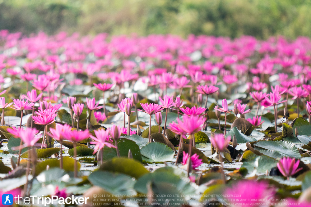 เช้าตรู่เราออกเดินทางจากกรุงเทพฯ ขับรถมุ่งหน้าสู่นครนายก สถานที่แรกที่เราแวะพัก และถือโอกาสถ่ายรูปสวย ๆ คือ "ทุ่งนาบัว" อ.บ้านนา มาช่วงเช้า ๆ แบบนี้เราจะเห็นดอกบัวแดงบานรับแสงทั่วทั้งทุ่ง บนพื้นที่กว่า 8 ไร่ แต่เดิมเคยเป็นพื้นที่ปลูกข้าว แต่ประสบปัญหาน้ำท่วมทำนาไม่ได้ผล จึงหันมาปลูกบัวแดงไว้ขาย และเป็นสถานที่ท่องเที่ยวแห่งใหม่ ที่ใครผ่านไปผ่านมาก็อดที่จะแวะลงไปชมความงามไม่ได้จริง ๆ