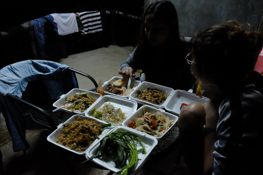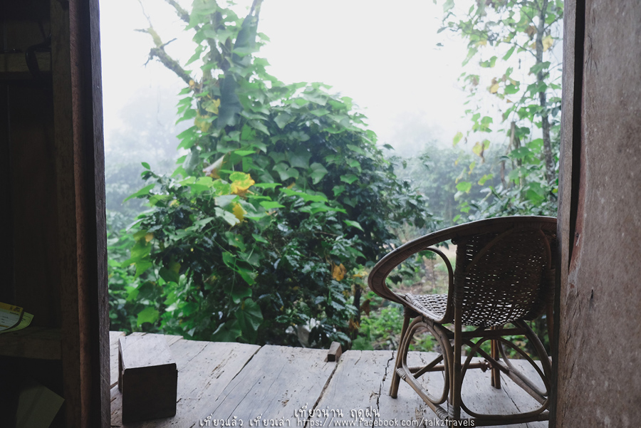 พี่กริชจัดแจงอาหารที่ทำเสร็จแต่ละอย่างลงบนโต๊ะที่มีใบตองรอง อาหารทุกอย่างน่ารับประทานมาก ๆ และเยอะมาก ๆ ตามคำขอของสี่สาวผู้หิวโหย เป็นอาหารที่อิ่มอร่อยที่สุดมื้อนึงในชีวิตเลย โฮมสเตย์ที่เราพักนั้นเป็นบ้านไม้รายล้อมไปด้วยสวนกาแฟของชาวบ้านสันเจริญ มีห้องน้ำแยกออกจากตัวบ้าน พลังงานไฟฟ้าเป็นพลังงานจากโซล่าเซลล์ ทำให้บ้านหลังนี้มีหลอดไฟส่องสว่าง วันที่เรามาฝนตกตลอดทั้งวันไม่มีแสงแดดพลังงานที่เก็บได้อาจไม่เต็มที่