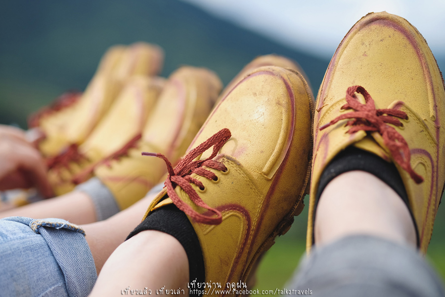 เราติดต่อพี่กริช เพจท่องเที่ยวดอยสวนยาหลวงไว้ ฝนตกหนักที่น่านตั้งแต่เราออกจากหอพักที่กรุงเทพแล้ว พี่กริชคอยรายงานสภาพอากาศตลอด ช่วงหน้าฝนรถจะขึ้นดอยไม่ได้เนื่องจากสภาพถนนที่ไม่อำนวย เราจำเป็นต้องเดินเท้าตั้งแต่สุดถนนคอนกรีตของหมู่บ้านขึ้นไปบนที่พักไร่กาแฟด้านบน และช่วงเช้ามืดจึงเดินต่อขึ้นไปชมหมอกบนยอดดอยสวนยาหลวง แต่ดูจากสภาพอากาศแล้วฝนน่าจะตกตลอดทั้งวันทั้งคืน ฟ้าปิดโอกาสจะได้เห็นหมอกคงริบรี่ พี่กริชให้เราตัดสินใจกันว่าจะเปลี่ยนแผนไปเที่ยวที่อื่นก็ได้ หรือจะตามเดิมแต่ต้องเดินเองแบกสัมภาระของตัวเองด้วย ส่วนหมอกนั้นอาจจะไม่ได้เห็นอย่างที่คาดหวัง ฝนก็ยังตกเล็กน้อย แต่เราก็มาถึงขนาดนี้แล้วก็อยากจะไปต่อเผื่อโชคดีฝนหยุดตกให้ได้เจอหมอกสวย ๆ เป็นไงเป็นกัน พี่กริชแจ้งว่าต้องเดินเท้าขึ้นเขาไปที่พักประมาณ 5 กม. ตอนเช้ามืดเดินขึ้นดอยสวนยาหลวงอีก 5 กม. ก็คิดว่าไม่น่าไกลมากคงพอเดินได้ เคยเดินม่อนจองเมื่อปลายปีที่แล้วก็ยังไหวอยู่ ตกลงตามนั้นก็จอดรถไว้ที่โรงกาแฟพี่กริช และกระโดดขึ้นรถกะบะพี่กริชไปยังจุดที่ต้องเดิน เนื่องจากสภาพทางเดินต้องลื่นและเละมากพี่กริชพาพวกเราไปซื้อรองเท้าสตั๊ดดอยยึดจับพื้นได้ดี กันน้ำเข้าเท้าได้ด้วย ราคาเพียง 70 บาท สีเหลืองวินเทจเก๋มาก