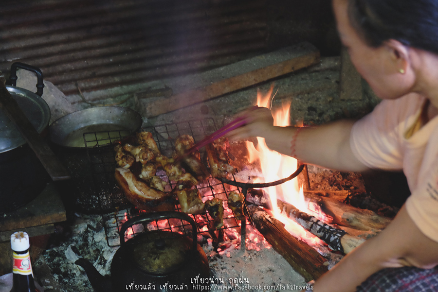 ระหว่างเดินรู้สึกหิว น้ำดื่มก็ลืมเตรียมมาด้วย เจออะไรกินได้ พี่กริชก็ช่วยเก็บมาให้ ทั้งเงาะ ฝรั่ง หรือแม้แต่เมล็ดกาแฟที่สุกก่อนฤดูเก็บเกี่ยวก็ยังอร่อย พอได้ประทังความกระหายจนถึงปลายทาง เก็บหน่อไม้ข้างทางไปทำอาหารเย็นนี้ด้วย กิโลเมตรสุดท้ายมีน้ำตกธรรมชาติดื่มได้ เย็นสดชื่นมาก รวมระยะเวลาพี่เราใช้เดินและแวะพักบ้างกว่าสามชั่วโมง รู้สึกเหนื่อยและหนักกระเป๋าที่สะพายอยู่ เหนื่อยยิ่งกว่าเดินขึ้นม่อนจองซะอีก อาจจะเป็นเพราะเราต้องแบกของเอง และทางก็มีช่วงที่ชันหลายช่วง ถึงที่พักแล้วเราอาบน้ำพักผ่อนตามอัธยาศัย ส่วนพี่กริชและคุณน้าที่รออยู่โฮมสเตย์นั้นช่วยกันทำอาหารเย็นให้พวกเราได้รับประทาน