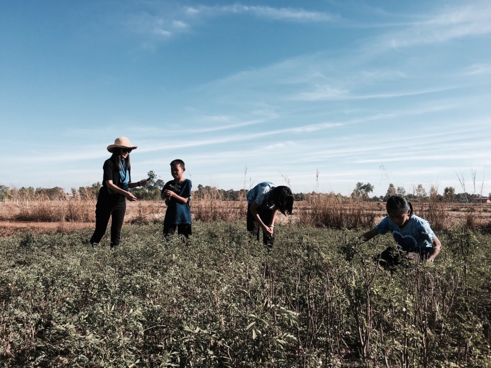 ก่อนอื่นชาวแก๊งผู้เชี่ยวชาญ พาโบว์เดินตระเวนออกหาวัตถุดิบมาทำเป็นแม่พิมพ์สำหรับพิมพ์ลายผ้ากันก่อนเลยค่ะ เก็บดอกไม้ใบหญ้าริมทาง แวะทักทายแม่ๆ รายทาง