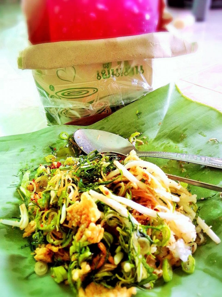 สุดท้ายมาสะดุดตรงข้าวยำ กลิ่นหอมของน้ำเคยแท้ชวนให้ลิ้มลอง บวกกับภาชนะที่ใส่คือใบตองตานีใบใหญ่ ปริมาณกับราคาพอเหมาะไม่แพงเกินไป เลยจัดการไปซะคนละ 2 ห่อ เอาให้หายอยาก 555
