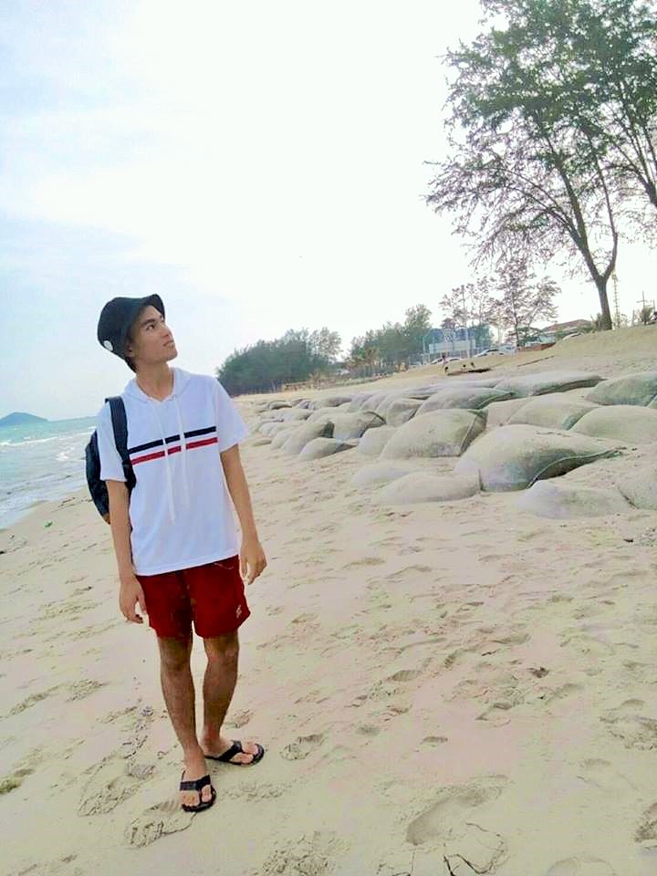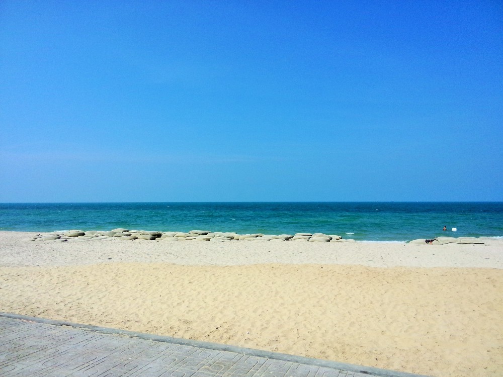 ลิบๆ ยังคงเห็นทิวสนทะเลเรียงตัวอย่างสวยงาม แต่ที่แปลกตาคือกระสอบทรายที่วางเรียงตัวเหมือนหินก้อนใหญ่ คอยกันคลื่นและน้ำทะเลเซาะชายหาดเพิ่มเติม