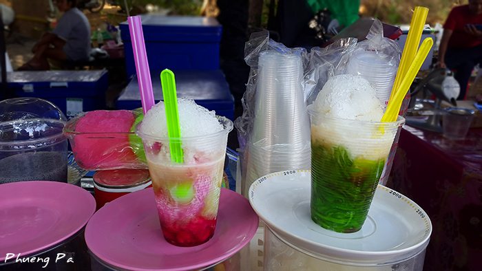 ลอดช่องน้ำตาลข้นค่ะ มันต่างกับลอดช่องทั่วไปยังไง ก็ตรงที่ ที่นี่จะเอาน้ำตาลโตนดสดๆ จากต้นตาล เคี่ยวจนข้นๆ มาใส่ในลอดช่องน่ะสิ ไม่ใช่เพียงแต่ลอดช่องเท่านั้นนะคะ ทับทิมกรอบ ซาหริ่ม ก็ใส่น้ำตาลข้น ใส่น้ำแข็งเย็นๆ ราดกะทิ บอกเลย อร่อยชื่นใจสุดๆ
