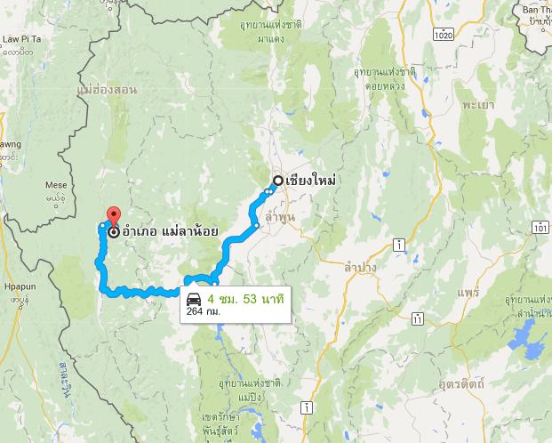 จากตัวเมืองเชียงใหม่ - อำเภอ แม่ลาน้อย ประมาณ 264 กิโลเมตร ใช้เวลาในการเดินทางประมาณ 3-4 ชั่วโมงกว่าๆ โดยใช้เส้นทางหลวงหมายเลข 108 เชียงใหม่-แม่ฮ่องสอน ครับ ปล. แล้วแต่จะขับช้าหรือเร็ว อย่างไงปลอดภัยไว้ก่อน