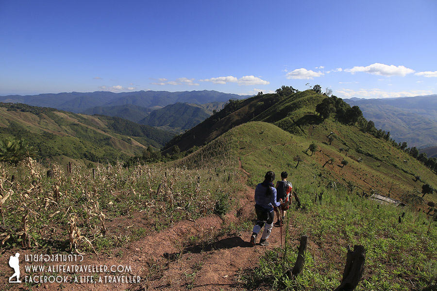 จากนี้แบ่งทางได้อีกสองช่วง ช่วงแรกราวสองกิโลเมตรเป็นทางเดินผ่านไร่ข้าวโพดของชาวบ้านบนภูเขา จากนั้นค่อยเข้าเขตป่าซึ่งเป็นทางชันสู่ยอดภูแวอีกราวสองกิโลเมตร
