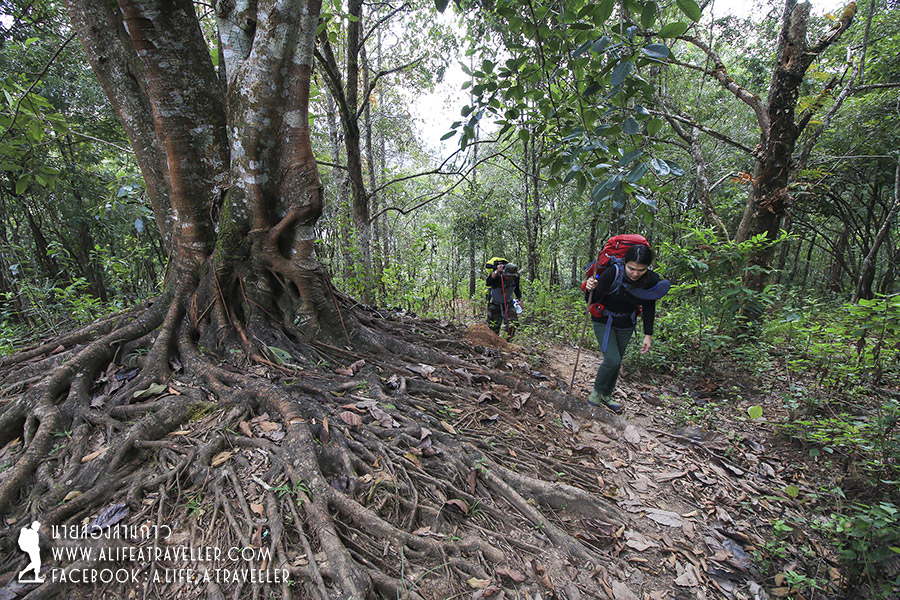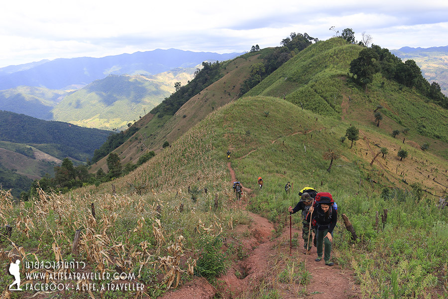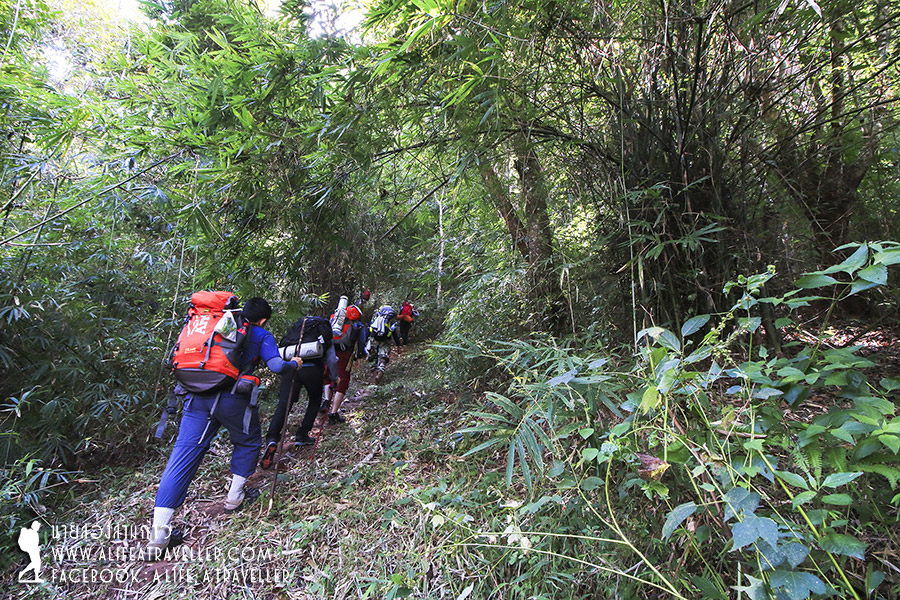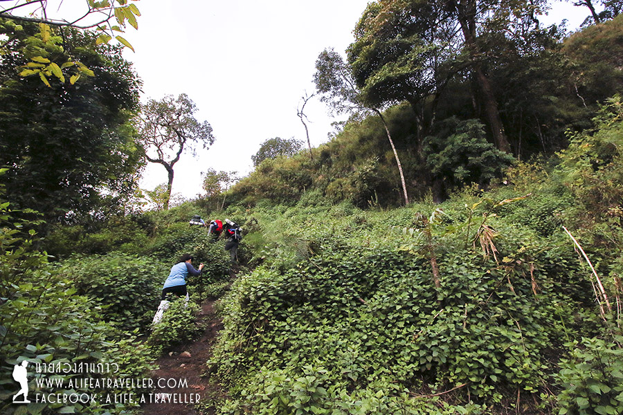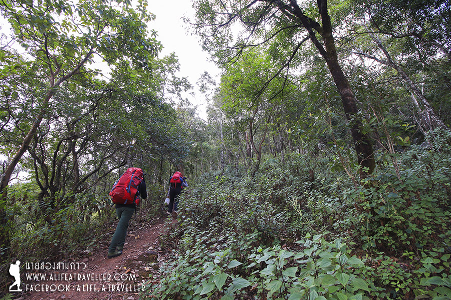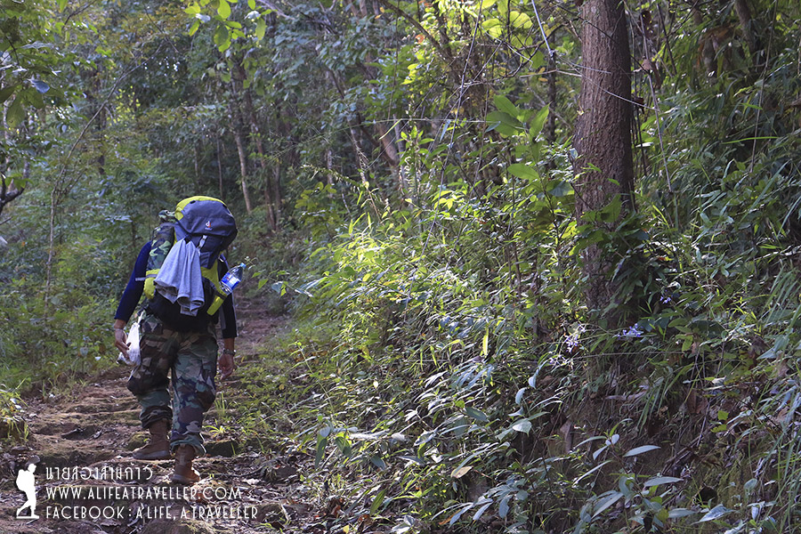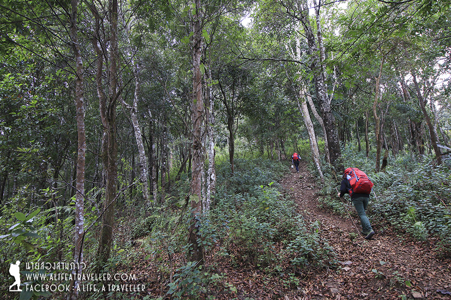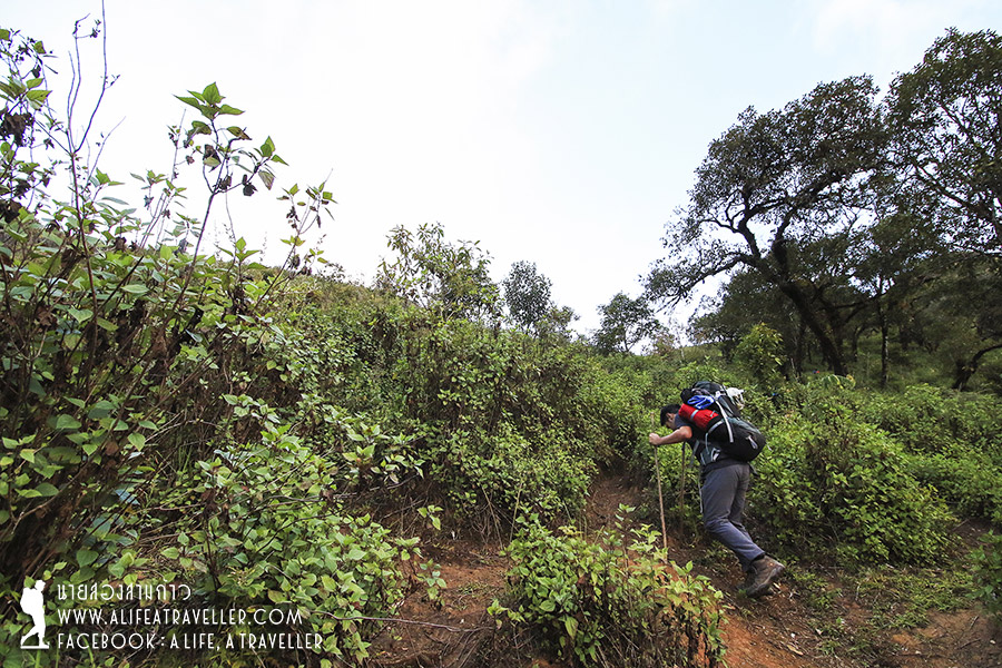 แบกเป้เดินขึ้นเขามาเรื่อยๆ แบบแทบไม่ได้หยุดพัก เพราะต้องแข่งกับเวลาเนื่องจากออกตัวกันสาย สัมภาระชักจะถ่วงไหล่ให้ทรุดลงทีละน้อย