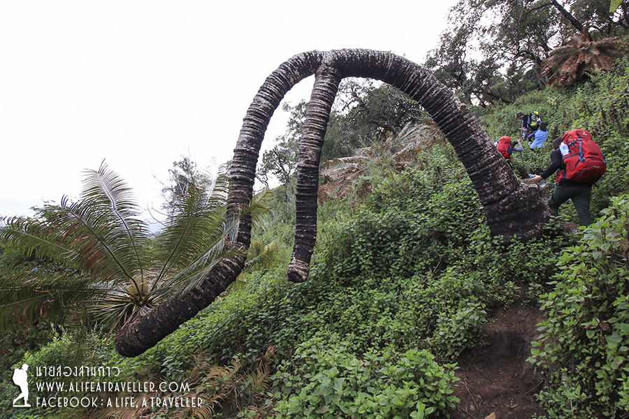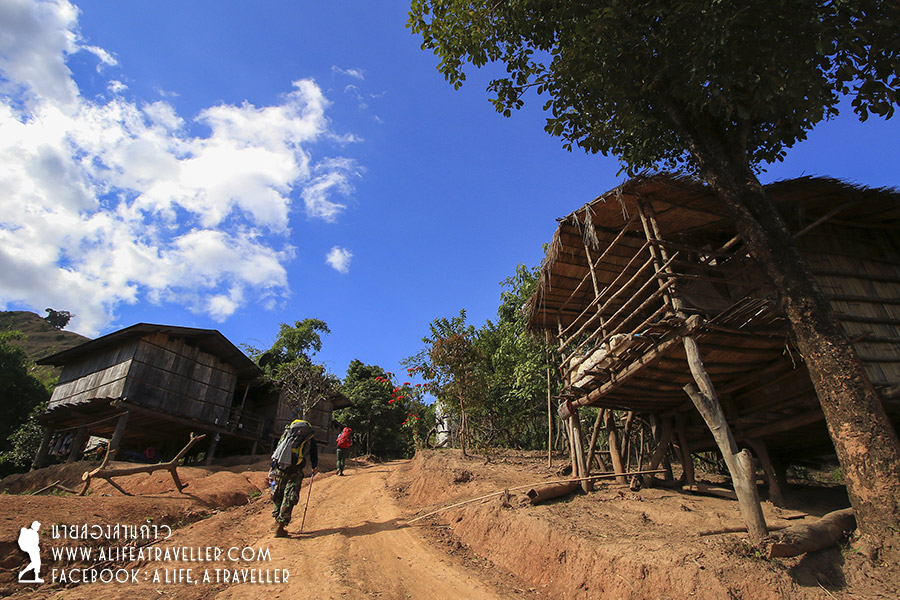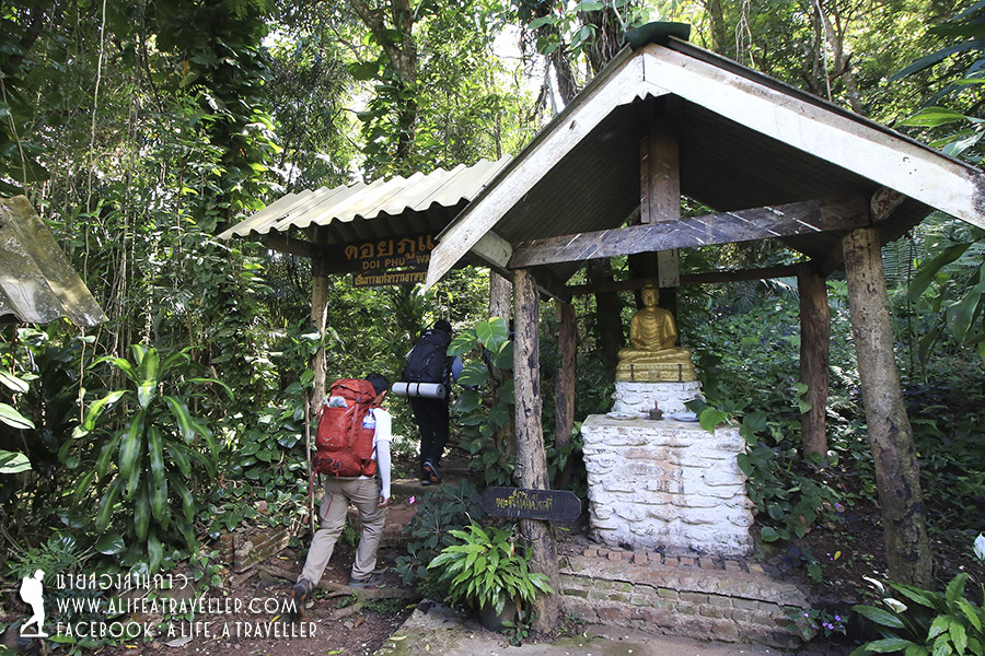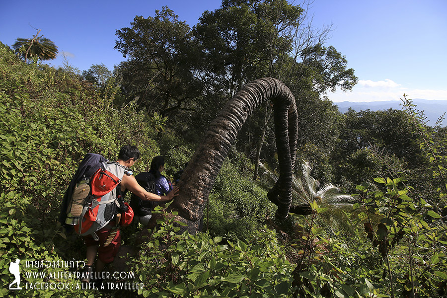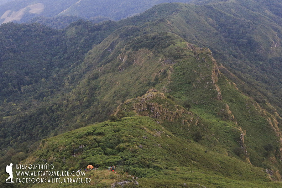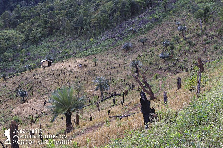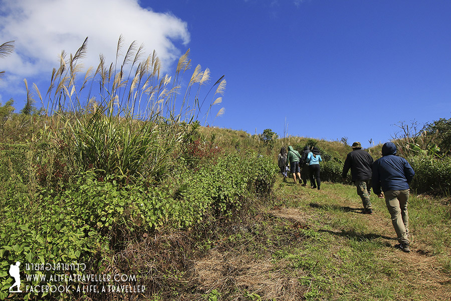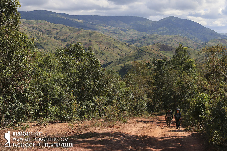 แบกเป้เดินขึ้นเขามาเรื่อยๆ แบบแทบไม่ได้หยุดพัก เพราะต้องแข่งกับเวลาเนื่องจากออกตัวกันสาย สัมภาระชักจะถ่วงไหล่ให้ทรุดลงทีละน้อย