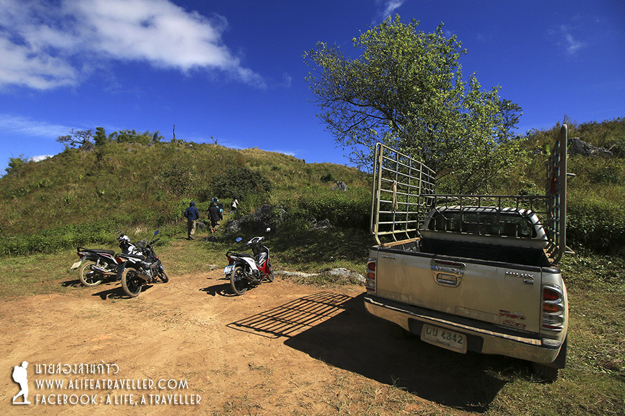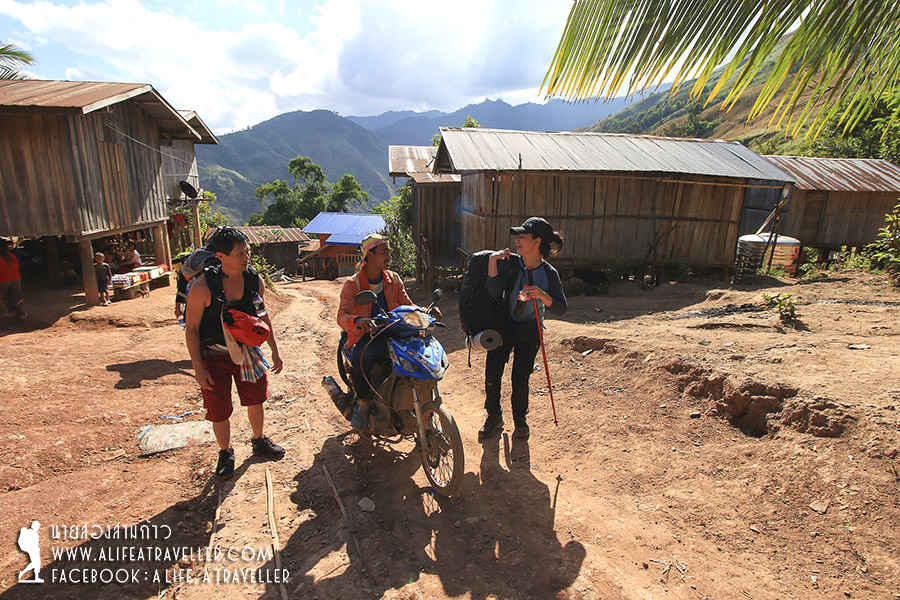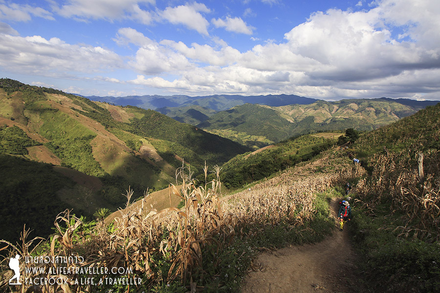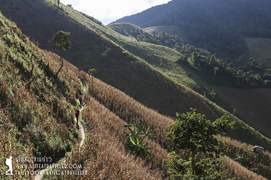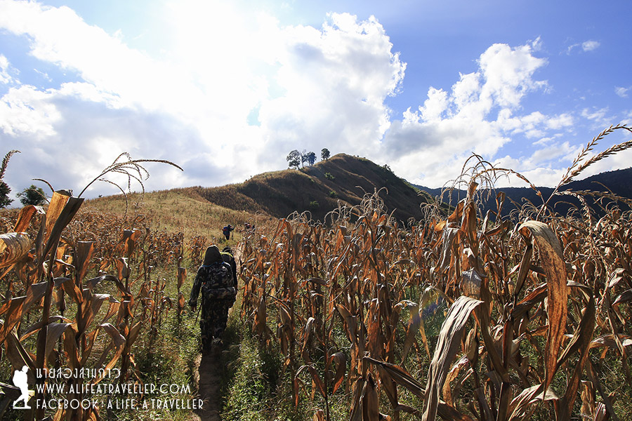 ทางเข้าไร่ข้าวโพดชาวบ้านน่ะมอเตอร์ไซค์วิ่งได้ สมาชิกในทีมคนหนึ่งเดินไม่ไหว เลยจ้างชาวบ้านขี่ไปส่งจนสุดทางที่ไปได้ซะเลย