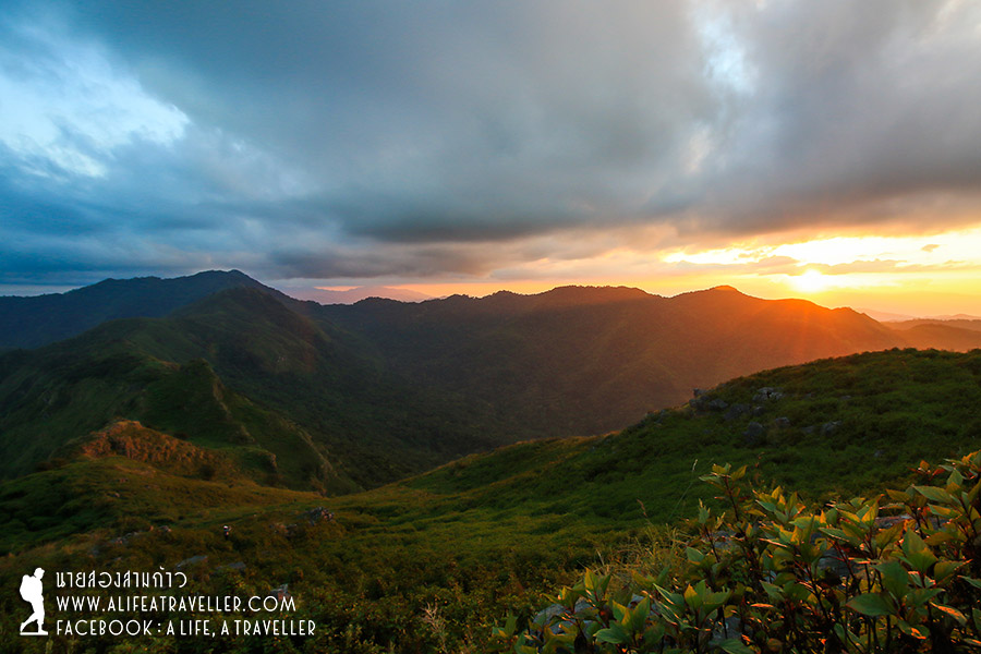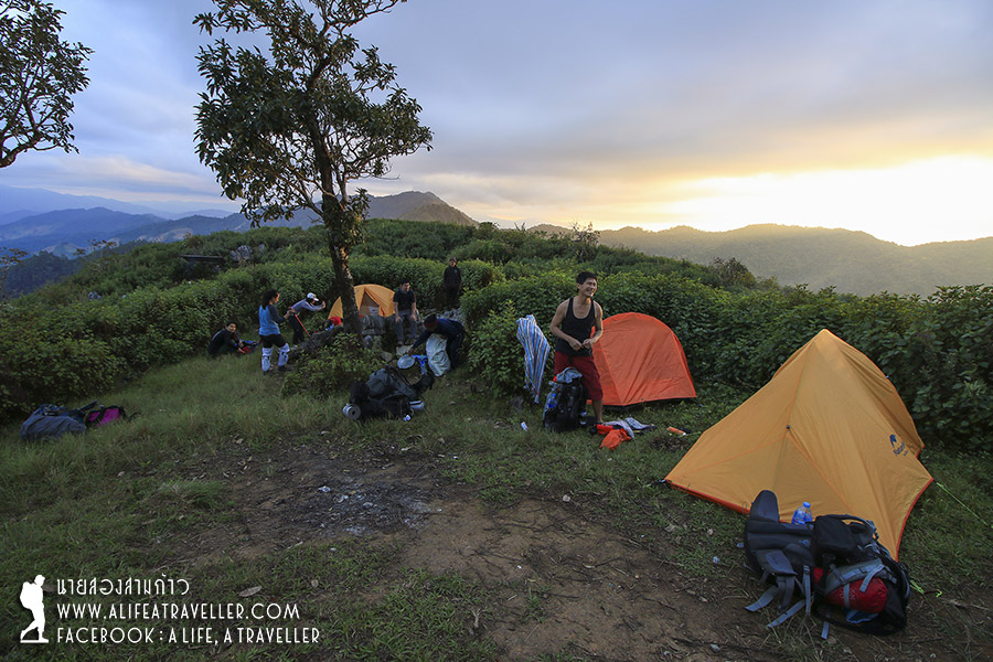 และในที่สุดห้าโมงสิบห้า รวมเวลาห้าชั่วโมงนิดๆ เราก็มาเหยียบจุดตั้งแคมป์กางเต็นท์ พระอาทิตย์กำลังเปล่งแสงใกล้ลับฟ้าพอดี ยอดภูแว 1,837 เมตร เหนือระดับน้ำทะเล อยู่เหนือจากนี้ไปอีกนิดเดียว พวกเราบางส่วนจัดแจงตั้งกางเต็นท์ บางส่วนเดินขึ้นไปชมวิวยอดดอย คงไม่ต้องบอกนะครับว่าผมเป็นพวกไหน