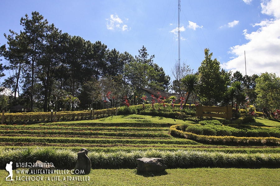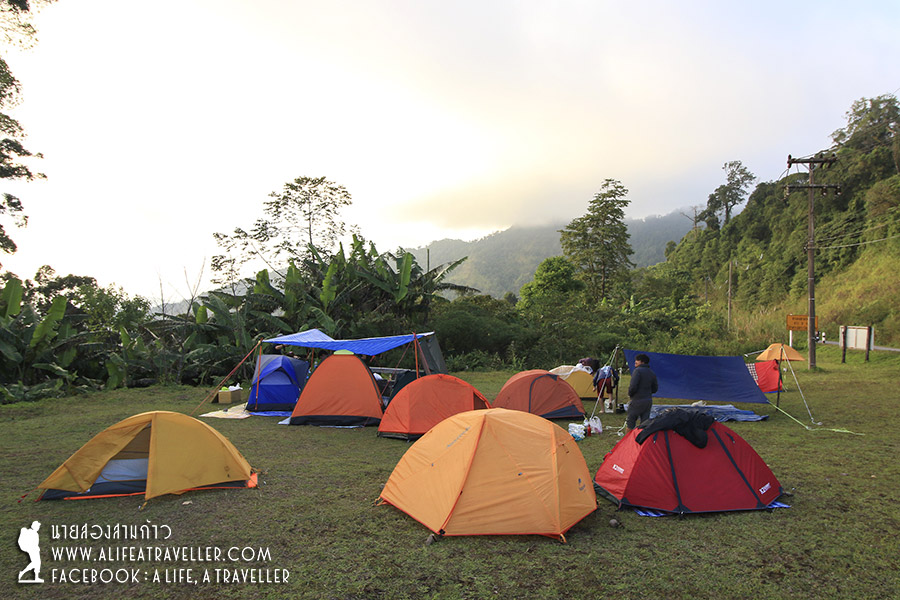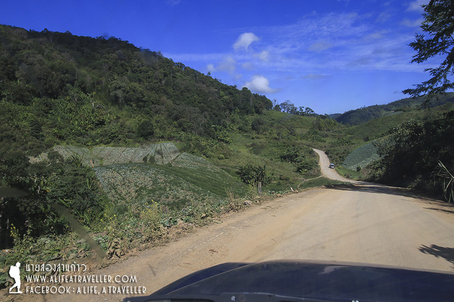 เส้นทางขึ้นเขาคดเคี้ยวให้พอมึนหัวใช้ได้เลย พอใกล้หมู่บ้านก็จะเจอแปลงกะหล่ำบนเขาเรียงราย จนมาถึงโครงการพัฒนาความมั่นคงพื้นที่ลุ่มน้ำน่านซึ่งเป็นจุดลงรถของเรา ตรงนี้เป็นจุดกางเต็นท์ของนักท่องเที่ยวด้วยครับ