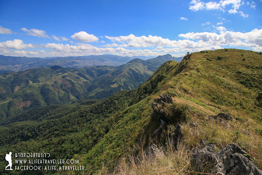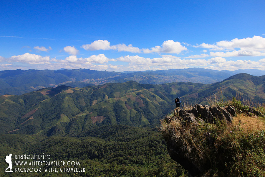 จากตรงนี้เรามองเห็นยอดภูแวอยู่ไม่ไกลด้วย ความจริงคือสองยอดนี้อยู่ห่างกันไม่มาก เพียงแต่ขึ้นเขามาจากคนละฝั่ง ชาวบ้านบอกว่ามีเส้นทางเดินจากดอยผาผึ้งไปภูแวด้วย ทว่าเป็นเส้นที่ไม่ได้ผ่านหน่วยพิทักษ์ฯ ของอุทยานฯ เจ้าหน้าจึงไม่แนะนำให้ใช้เส้นนี้
