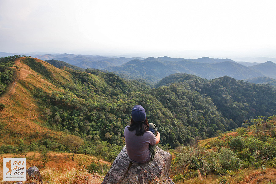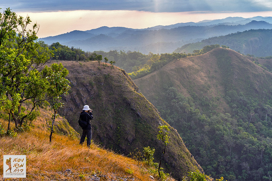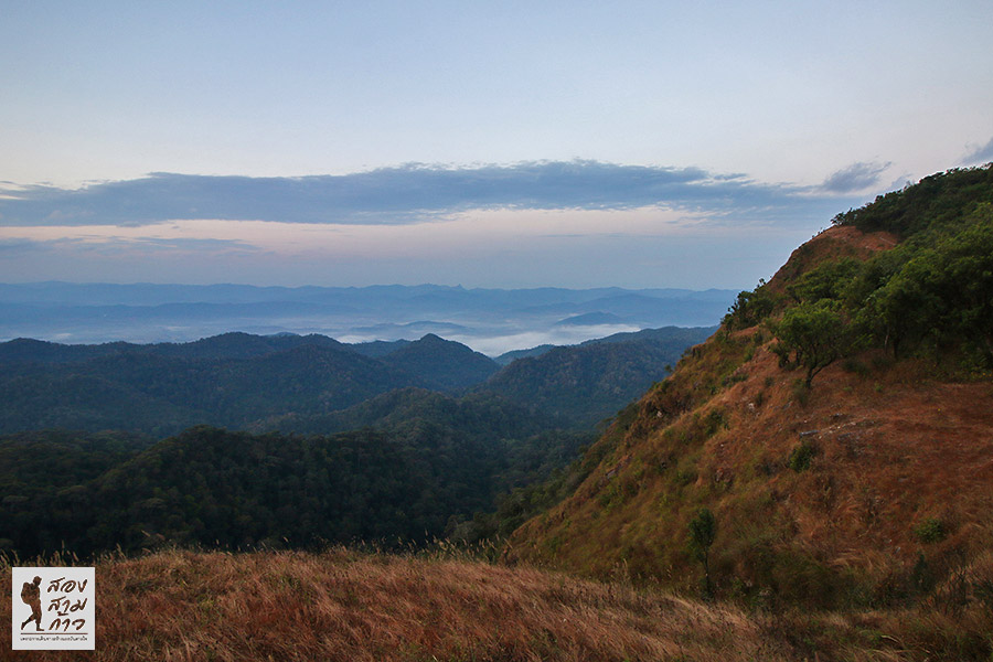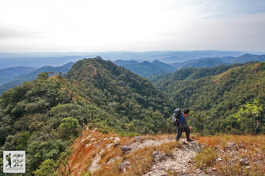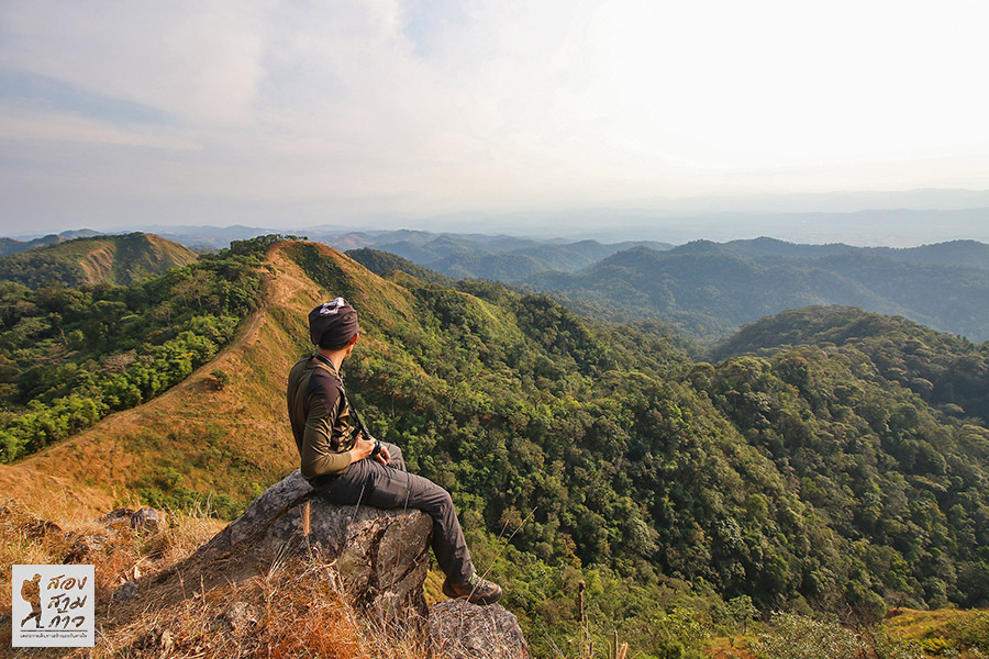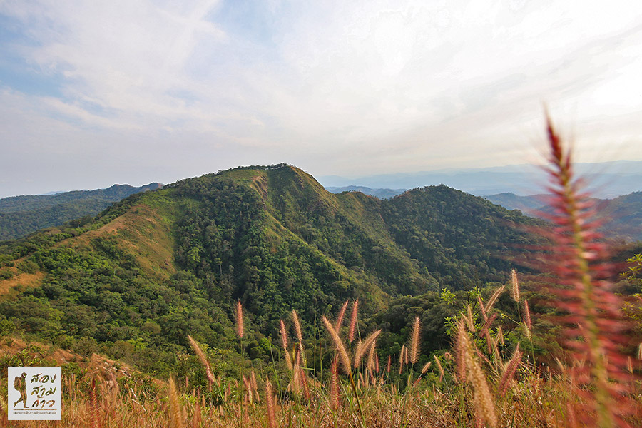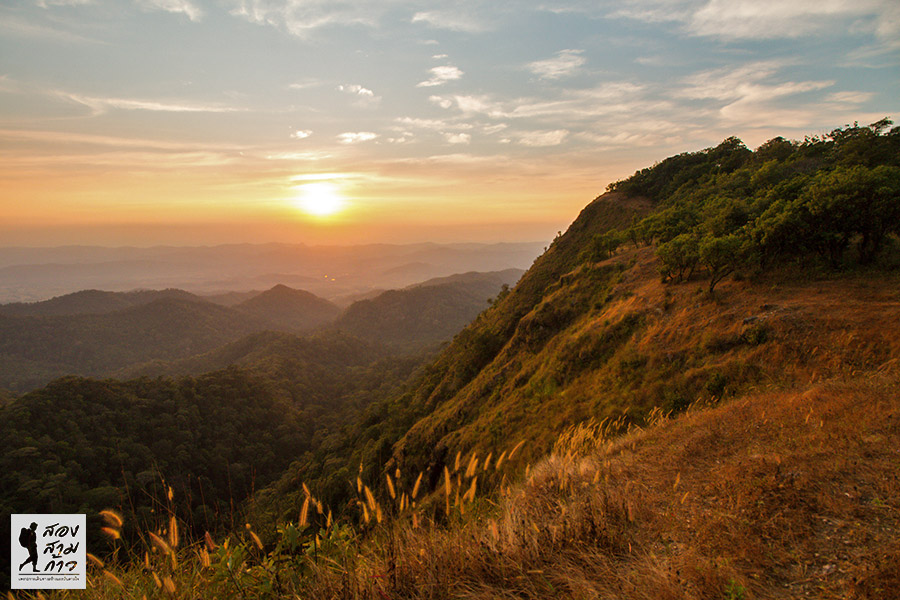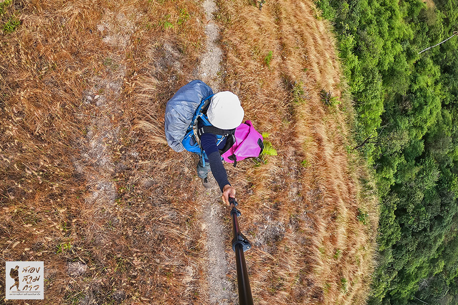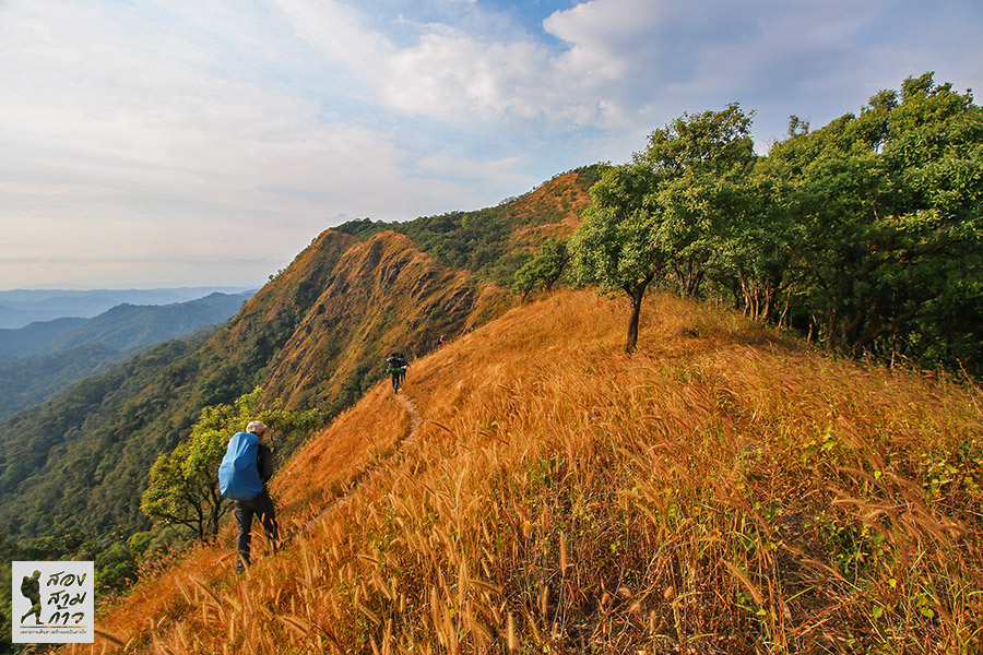 นั่นแหละครับเนินชันเนินสุดท้าย หลังจากนี้จะเดินเลาะตามสันเขา ช่วงที่เราไปหญ้าเริ่มแห้งแถมดอกหญ้ากำลังออก สะท้อนแดดกลายเป็นทางเดินสีทองสวยน่าประทับใจมาก แต่อย่าชมวิวเพลินเกินไปล่ะ เพราะบางช่วงหากเผลอก้าวผิดทิศผิดทางอาจลงยาวหล่นหายวับไปในป่าเลยก็ได้