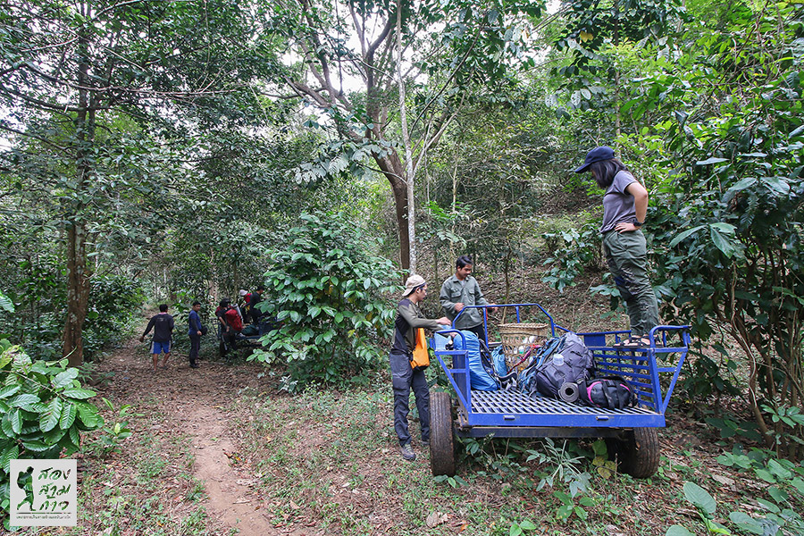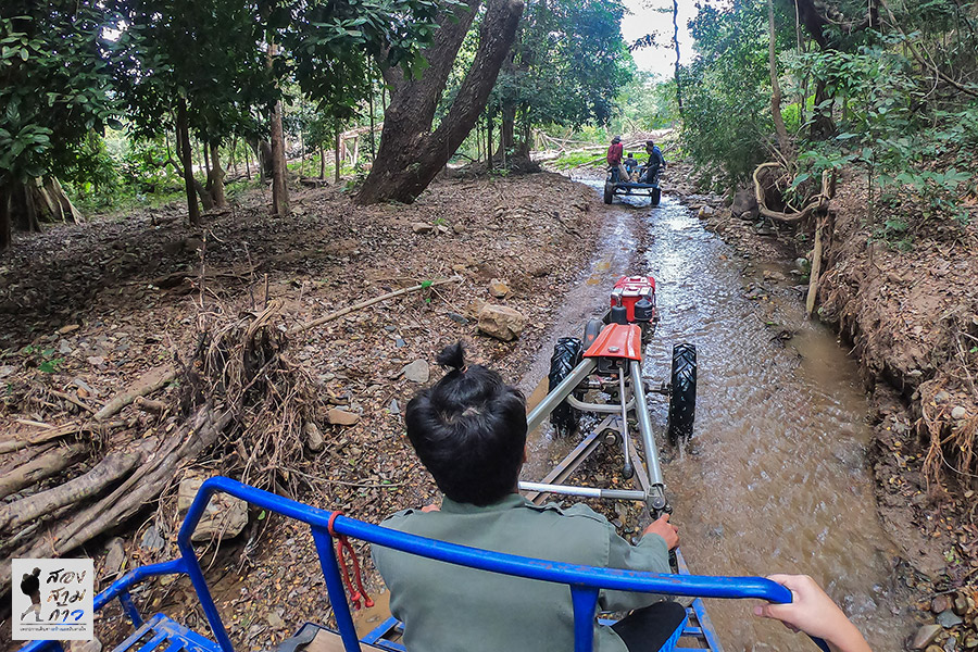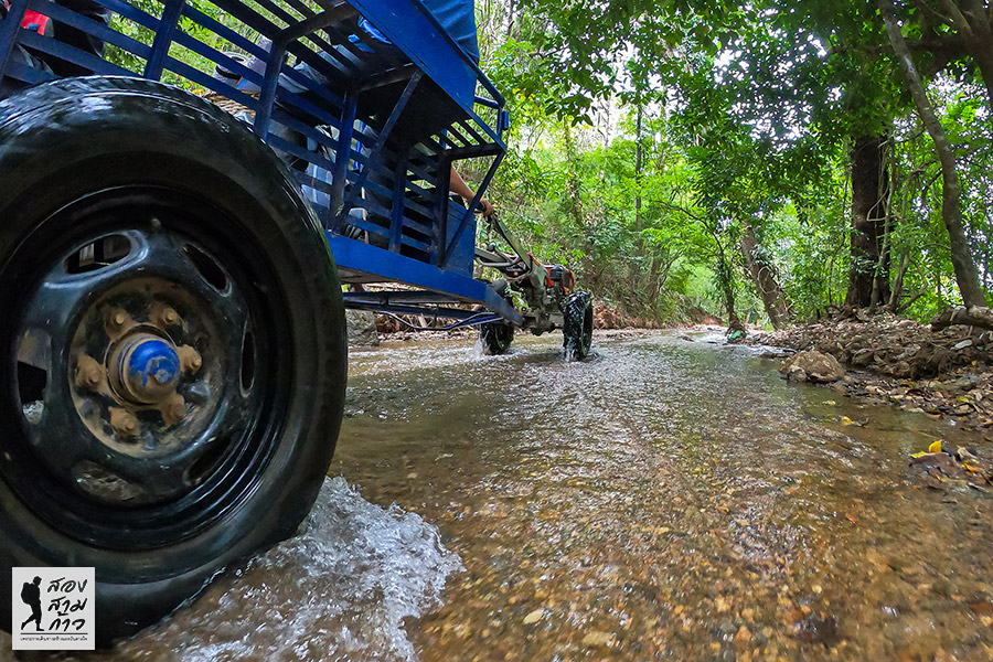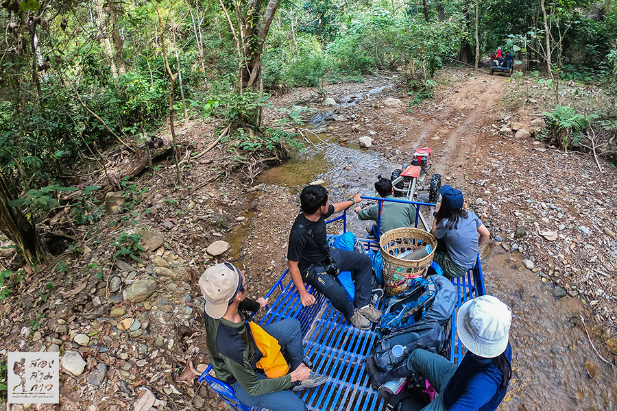 ความสนุกก่อนเหนื่อยคือเราต้องนั่งรถอีแต๊กจากวัดปูแป้ต่อเข้าไปจุดเริ่มเดิน ผ่านทั้งถนนลูกรัง ลำห้วย สองข้างทางเป็นพื้นที่ถากถางทำเกษตรบ้าง ป่าปลูกบ้าง นั่งหัวโยกหัวคลอนกันประมาณครึ่งชั่วโมงครับ