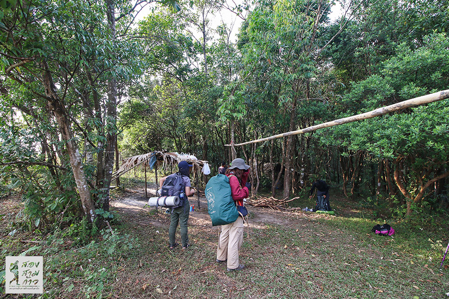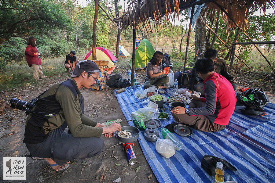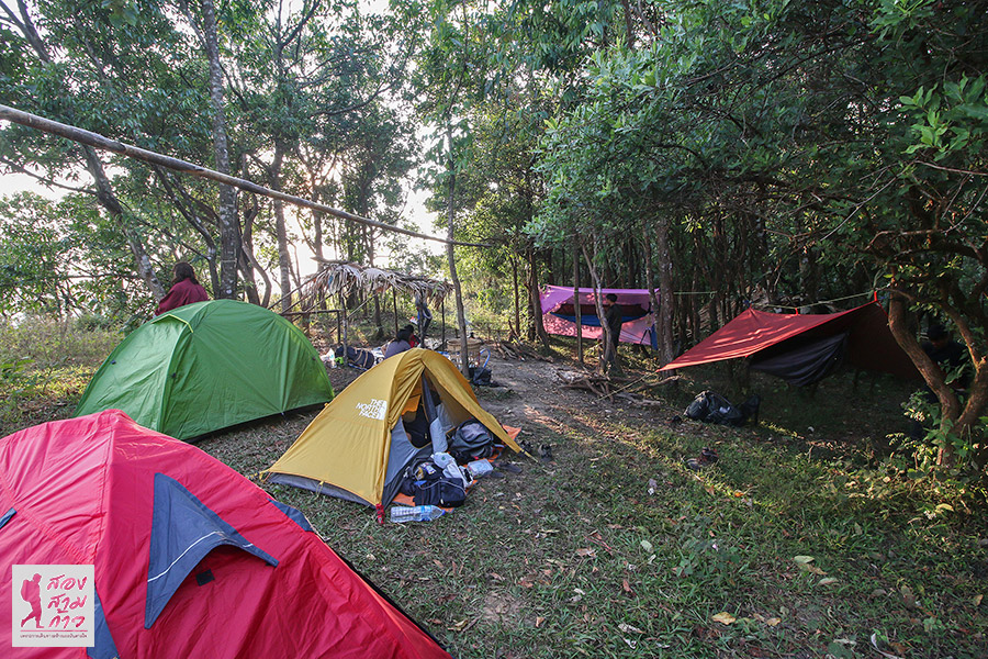 จากจุดถ่ายรูป เดินทะลุชายป่าอีกไม่เกินห้านาทีก็ถึงจุดตั้งแคมป์ สภาพพื้นที่ช่วงหน้าแล้งแจ๋วมาก เต็นท์ดี เปลสะดวก มีเพิงที่ชาวบ้านทำไว้อีกสองหลัง เราสามารถใช้พื้นที่ได้เลย สัญญาณโทรศัพท์ สัญญาณอินเทอร์เน็ต มีครบทุกเครือข่าย
