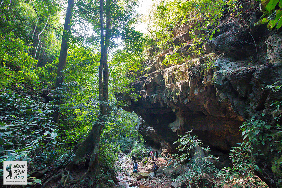 ประมาณชั่วโมงนิดๆ ก็ลงมาถึงลำห้วย บอกเลยว่ามีจุดที่สวยมากๆ คือบริเวณถ้ำใต้หน้าผาตรงนี้ ถามไกด์ว่าเรียกว่าอะไร ไกด์นั่งคิดอยู่ตั้งนานแล้วบอกว่าชื่อถ้ำพอโทะเล