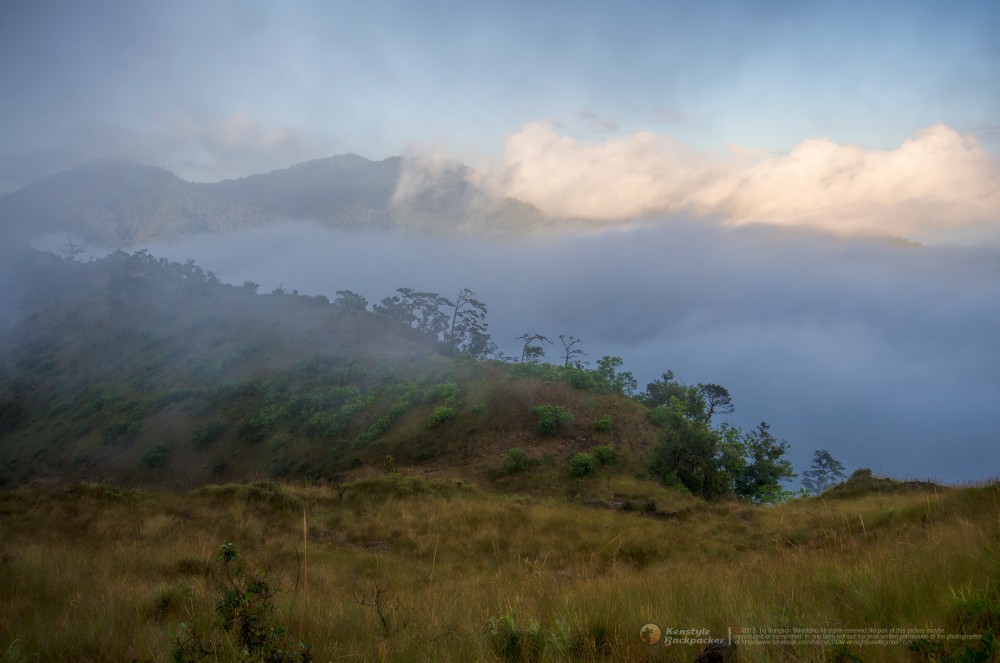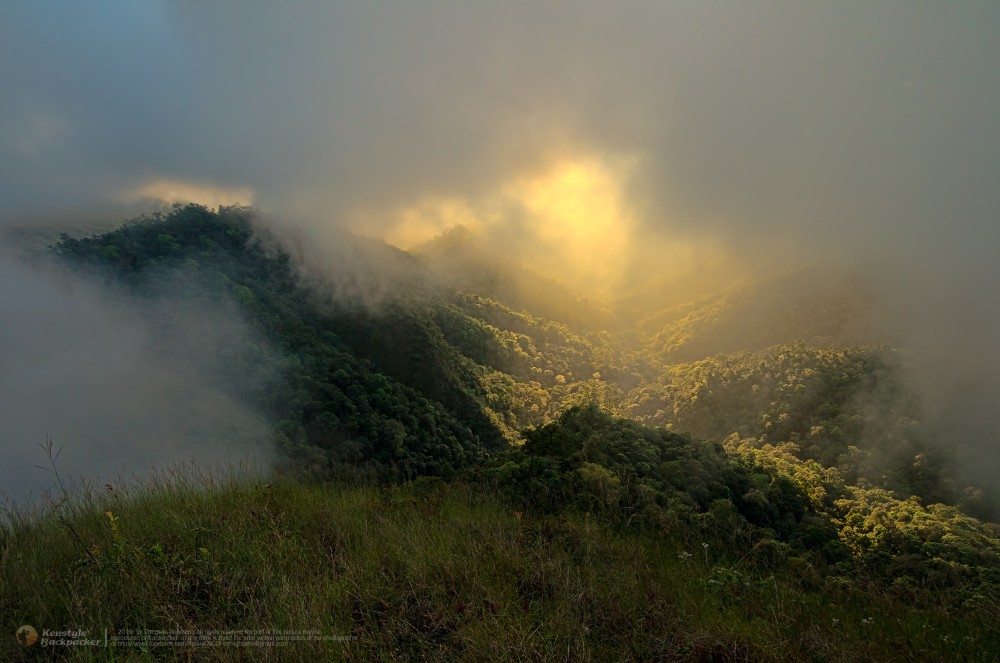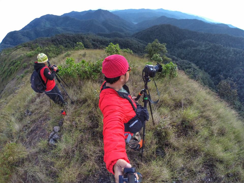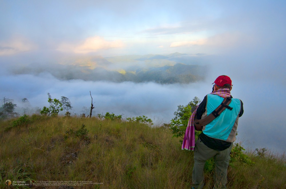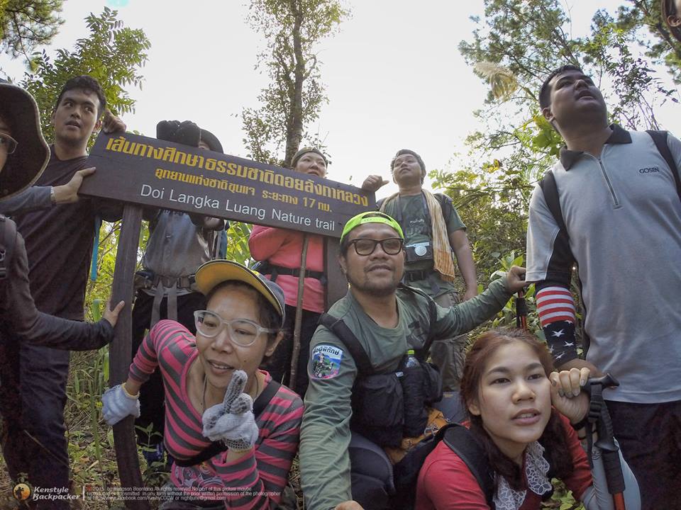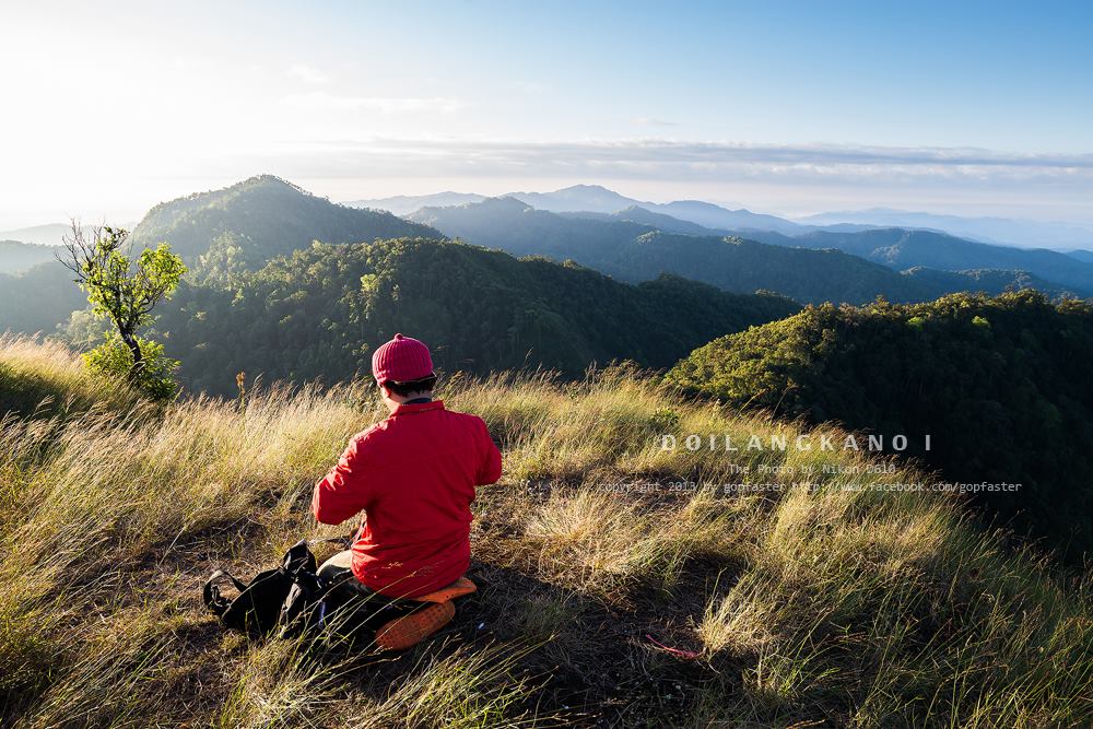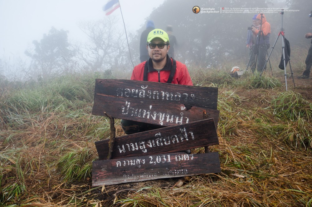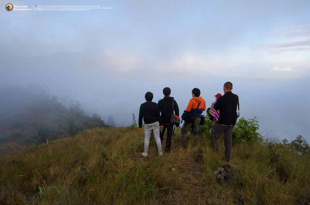 ฟ้าเริ่มสว่างมองเห็นเมฆหมอกลอยฟูฟ่องอยู่เบื้องหน้า และพอมองย้อนลงไปทางที่เราขึ้นมาหมอกจากอีกฝั่งจะลอยข้ามหุบเขาด้านซ้ายไปยังด้านขวา สลับกับอากาศปิดๆเปิดๆเป็นระยะๆเพราะลมในหุบมันตีขึ้นทำให้หมอกค่อนข้างฟุ้ง ช่วงที่รออากาศเปิดเราก็ถ่ายรูปเล่นกันบนยอดสูงสุดของดอยลังกาหลวงที่ความสูง 2031 เมตรจากระดับน้ำทะเลสูงเป็นอันดับ 5 ของดอยที่มีความสูงที่สุดในประเทศ