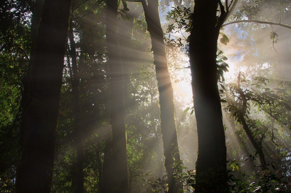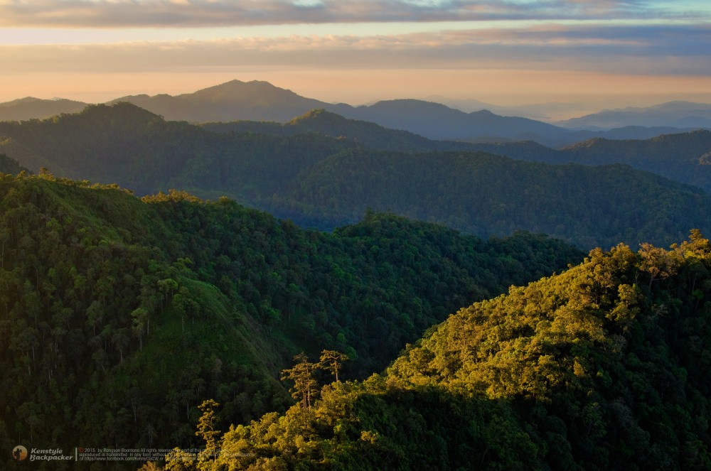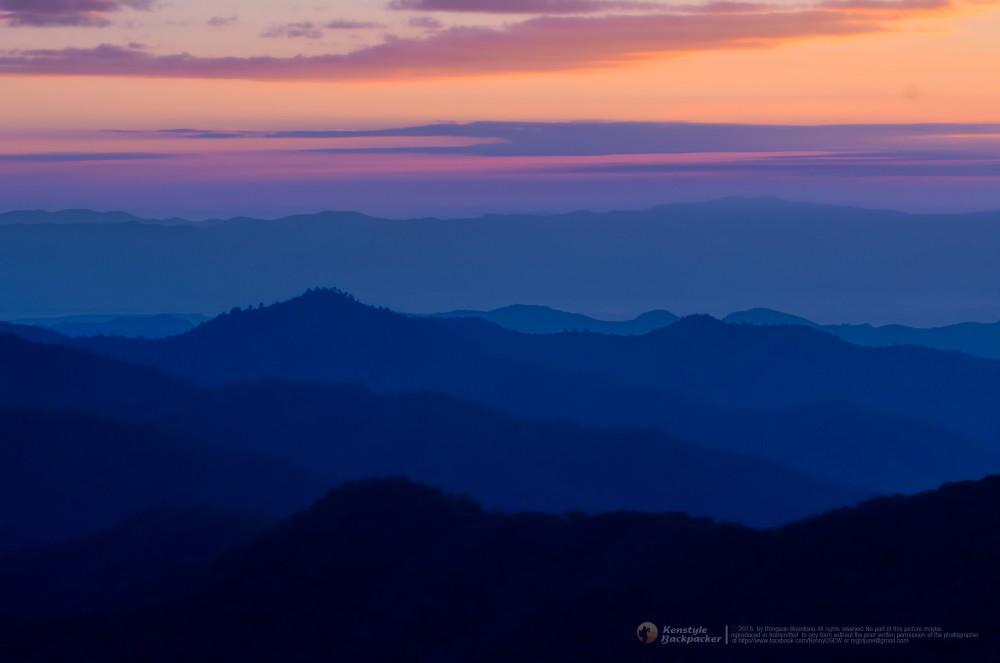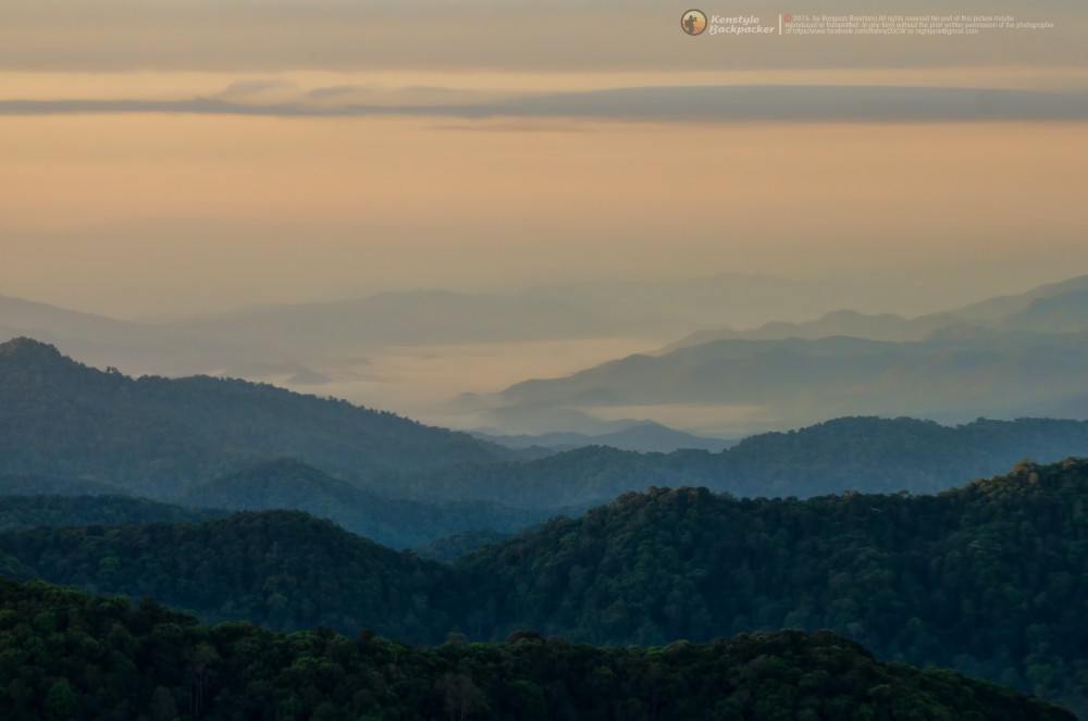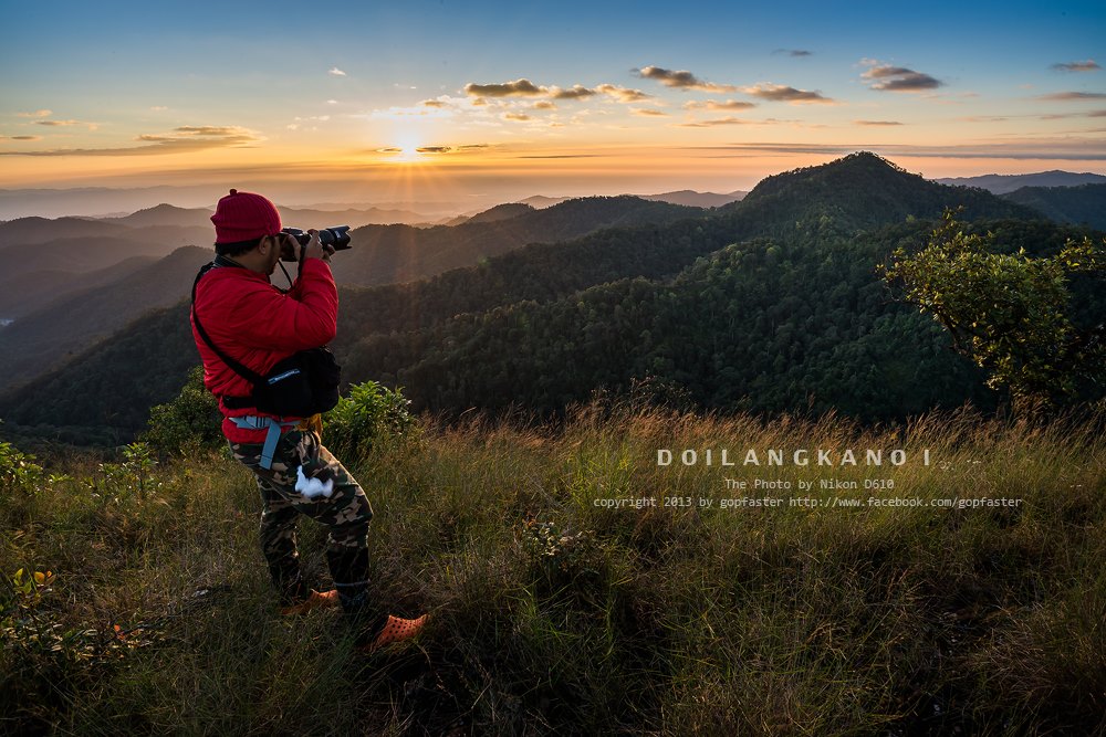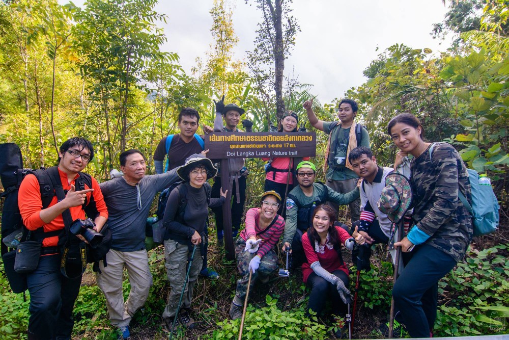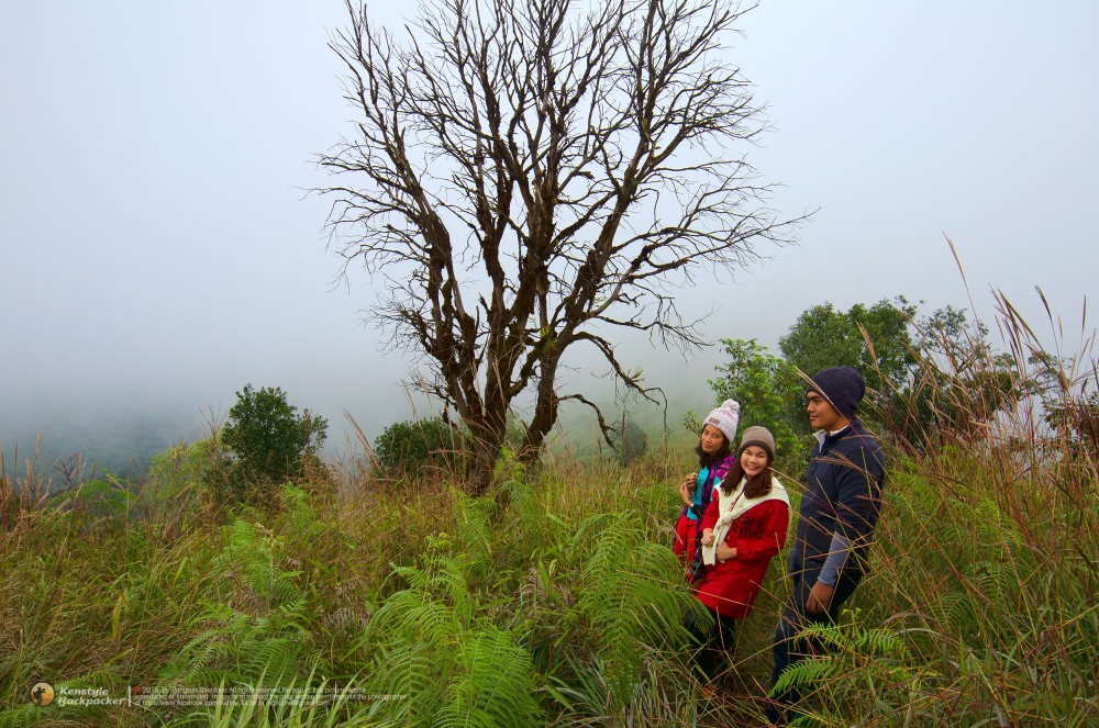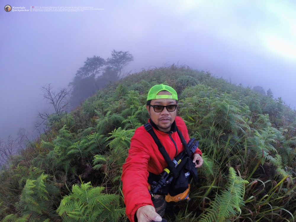 ฟ้าเริ่มสว่างมองเห็นเมฆหมอกลอยฟูฟ่องอยู่เบื้องหน้า และพอมองย้อนลงไปทางที่เราขึ้นมาหมอกจากอีกฝั่งจะลอยข้ามหุบเขาด้านซ้ายไปยังด้านขวา สลับกับอากาศปิดๆเปิดๆเป็นระยะๆเพราะลมในหุบมันตีขึ้นทำให้หมอกค่อนข้างฟุ้ง ช่วงที่รออากาศเปิดเราก็ถ่ายรูปเล่นกันบนยอดสูงสุดของดอยลังกาหลวงที่ความสูง 2031 เมตรจากระดับน้ำทะเลสูงเป็นอันดับ 5 ของดอยที่มีความสูงที่สุดในประเทศ