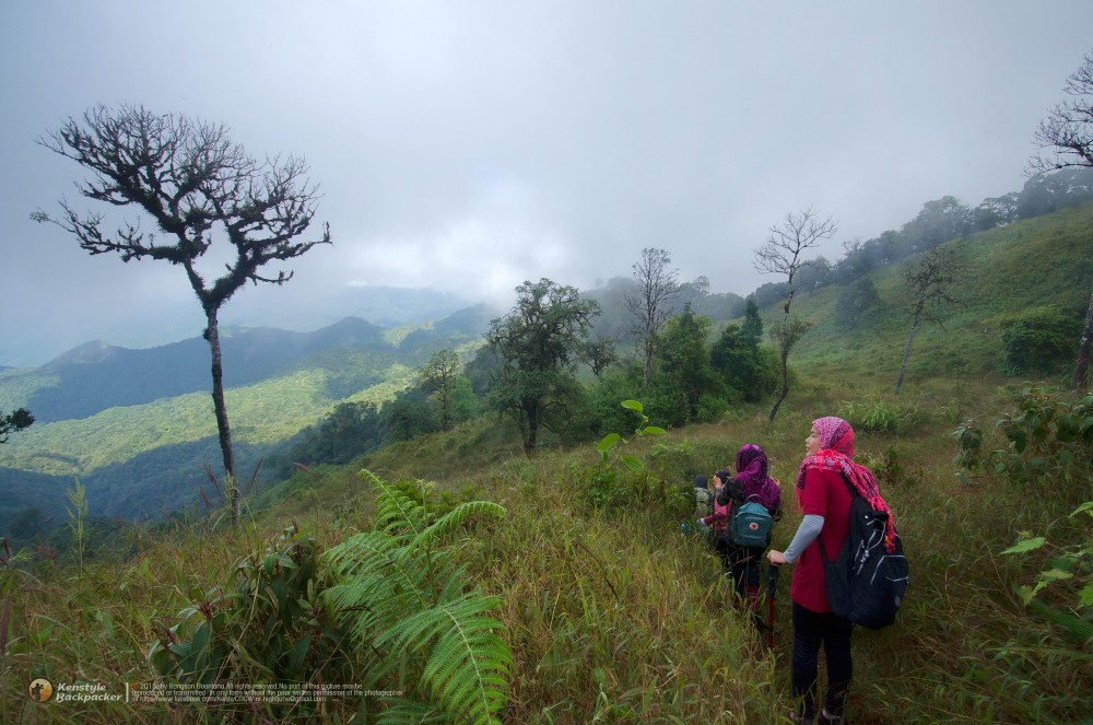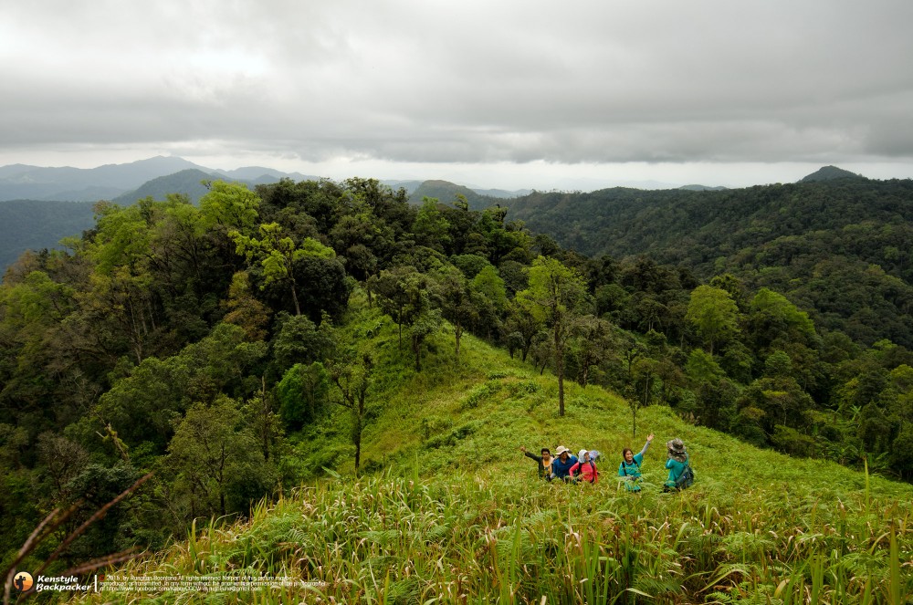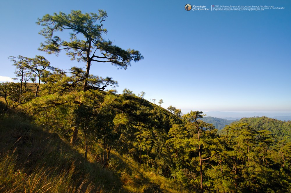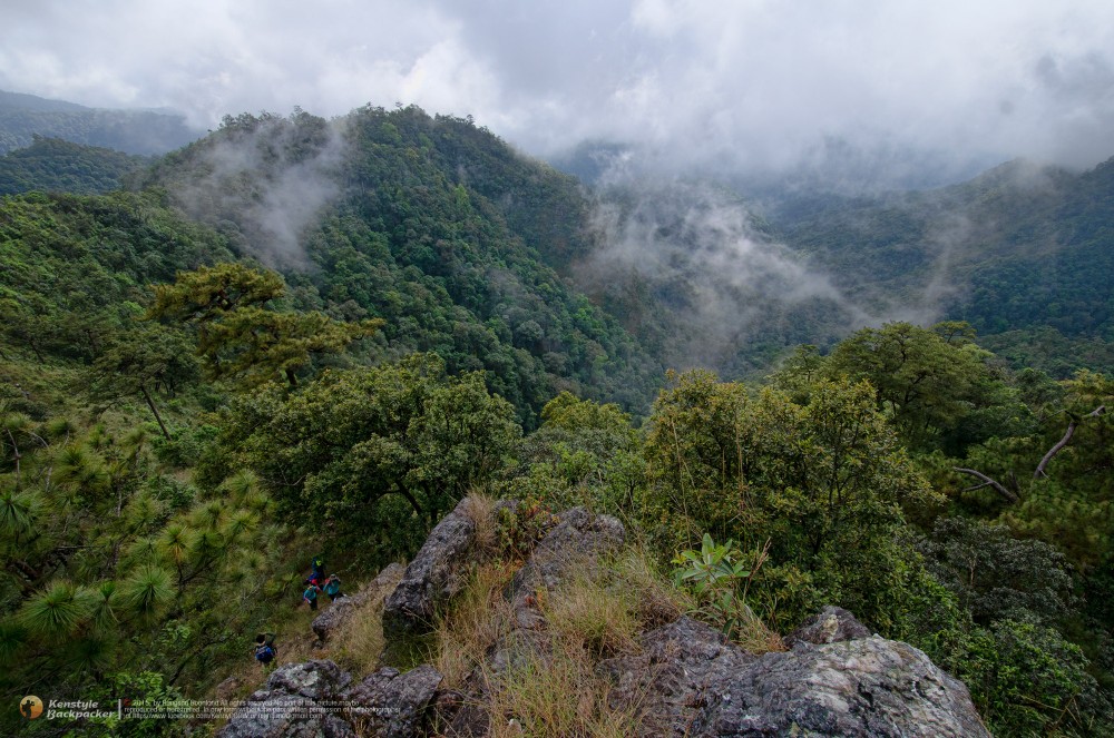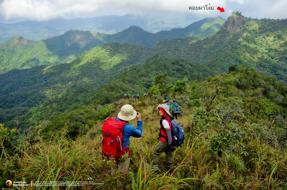 เราเดินลัดเลาะไปตามสันดอยลูกแล้วลูกเล่า ก็มาถึงบริเวณสันดอยลูกหนึ่ง ซึ่งมองเห็นหุบเขาเบื้องล่างและวิวทิวทัศน์ได้แบบรอบตัวและมองเห็นดอยผาโง้มอยู่ไกลๆ จึงหยุดถ่ายภาพกันเป็นที่ระลึกก่อนจะออกเดินทางต่อ