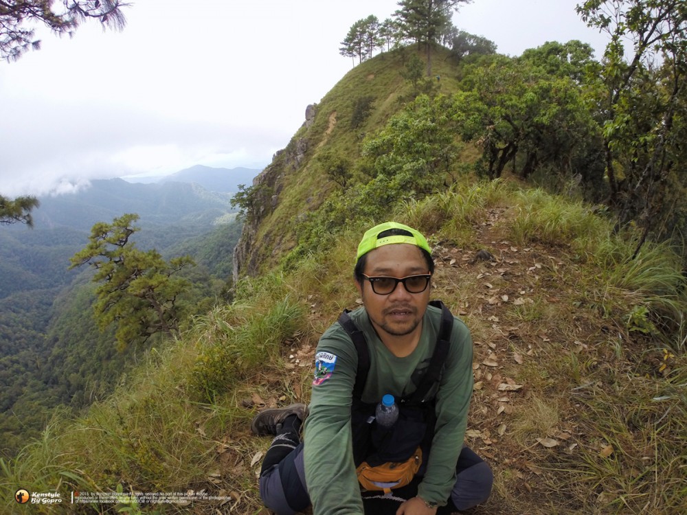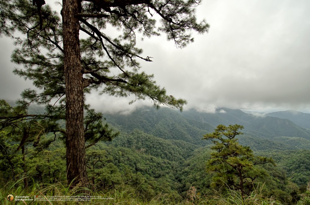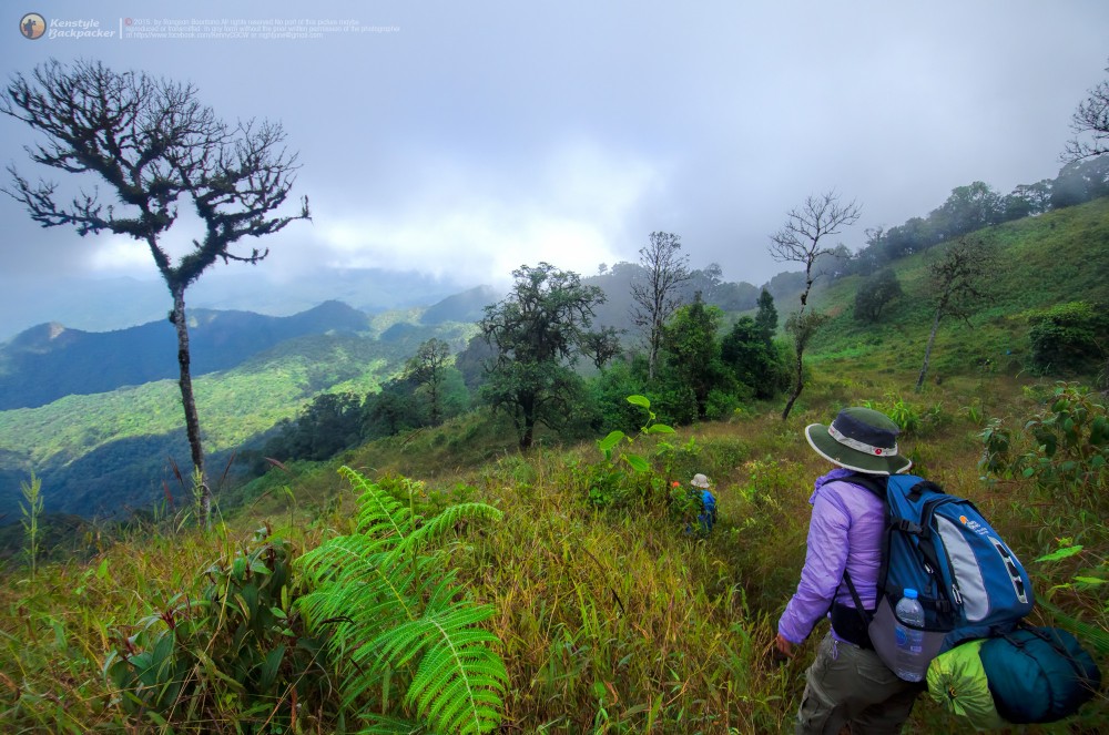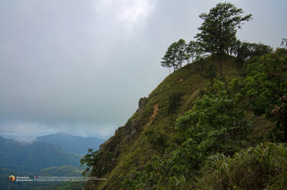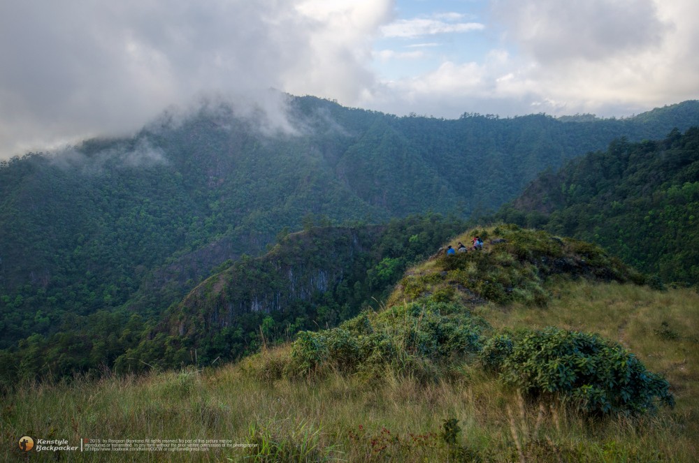 เราเดินลัดเลาะไปตามสันดอยลูกแล้วลูกเล่า ก็มาถึงบริเวณสันดอยลูกหนึ่ง ซึ่งมองเห็นหุบเขาเบื้องล่างและวิวทิวทัศน์ได้แบบรอบตัวและมองเห็นดอยผาโง้มอยู่ไกลๆ จึงหยุดถ่ายภาพกันเป็นที่ระลึกก่อนจะออกเดินทางต่อ