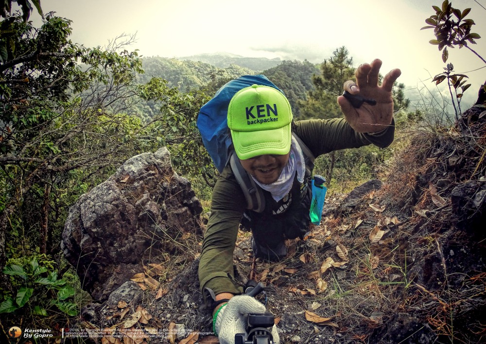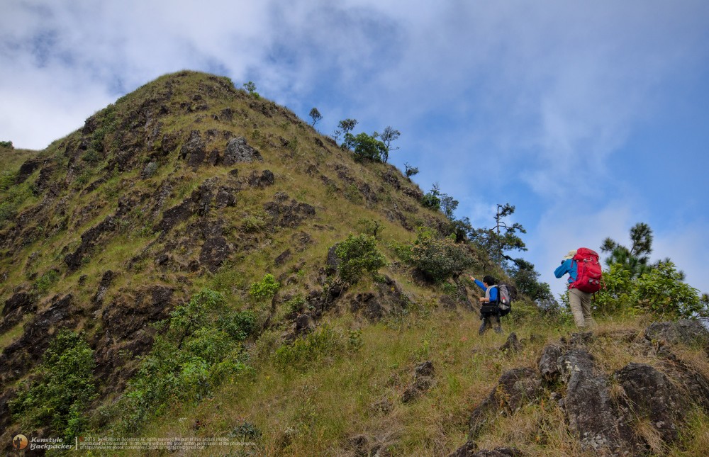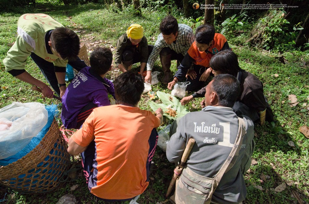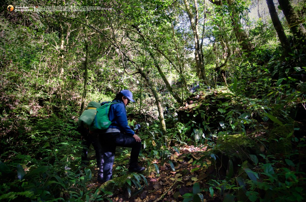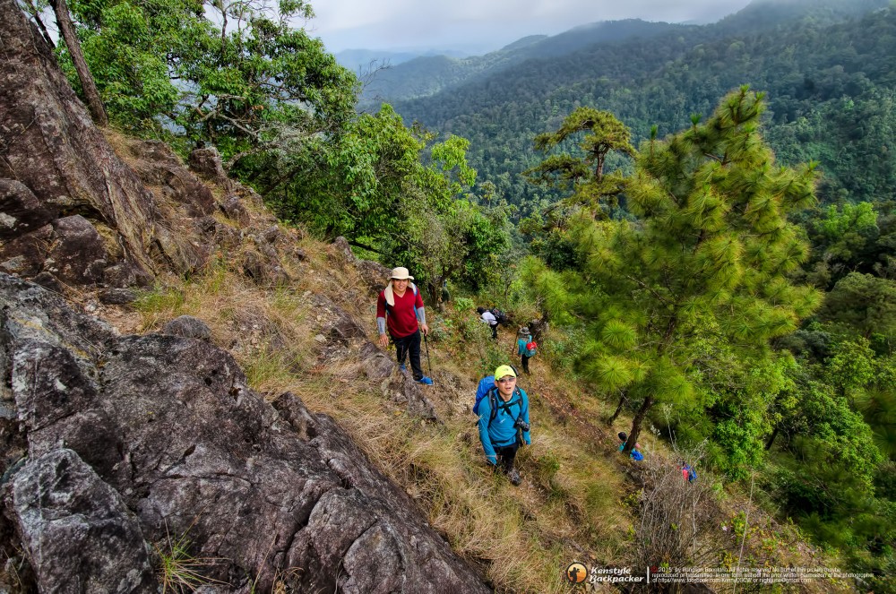 หลังจากนั้นเราเดินลงหุบอีกครั้งแล้วค่อยๆ ไต่ไปตามความสูงของดอยผาโง้ม ซึ่งดอยนี้เป็นดอยที่สร้างความลำบากและท้อใจเป็นอย่างมากที่เดินเท่าไหร่ก็ไม่ถึงยอดสักที เดินๆหยุดๆเพราะความชัน ถึงแม้เส้นทางเดินจะง่าย และความสูงแค่ 1,700 เมตร น้อยกว่าลังกาหลวงหลายร้อยเมตร แต่เหนื่อยกว่ามาก เพราะมันชันยาวเลยทีเดียว น้องข้างหลังที่เคยมาเล่าให้ฟังว่าถ้าไม่ไต่ขึ้นดอยมาจะมีทางลัดเลาะหุบเหวข้างล่างซึ่งทางจะค่อนข้างอันตราย และเป็นทางที่อ้อมเขาไป และถ้าพ้นผาโง้มไปก็สบายแล้ว จริงๆแล้วเราจะพักกินข้าวกลางวันกันที่นี่ แต่ลูกหาบคงฟังภาษาไทยไม่ค่อยเข้าใจ จึงตั้งหน้าตั้งตาเดินนำลิ่วไปโดยไม่รอ แถมไอ้คนที่นำลิ่วไปก็เป็นคนที่ขนเสบียงอาหารซะเนี้ยะ ต้องให้ลูกหาบอีกคนไล่กวดตามไปบอกว่าให้เอาอาหารกลางวันมาให้พวกเราระหว่างทางด้วย ช่วงนี้ใครมีอะไรกินก็แบ่งปันกันไป นี่แหละน้ำใจเพื่อนร่วมทางถึงแม้จะไม่เคยเจอกันมาก่อน แต่ความลำบากก็ช่วยหล่อหลอมให้เราเป็นหนึ่งเดียวกันได้