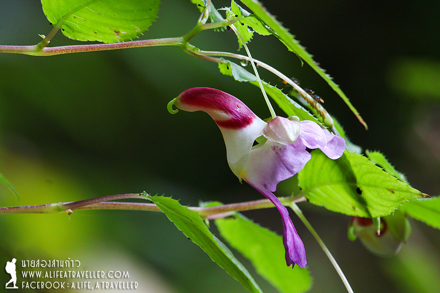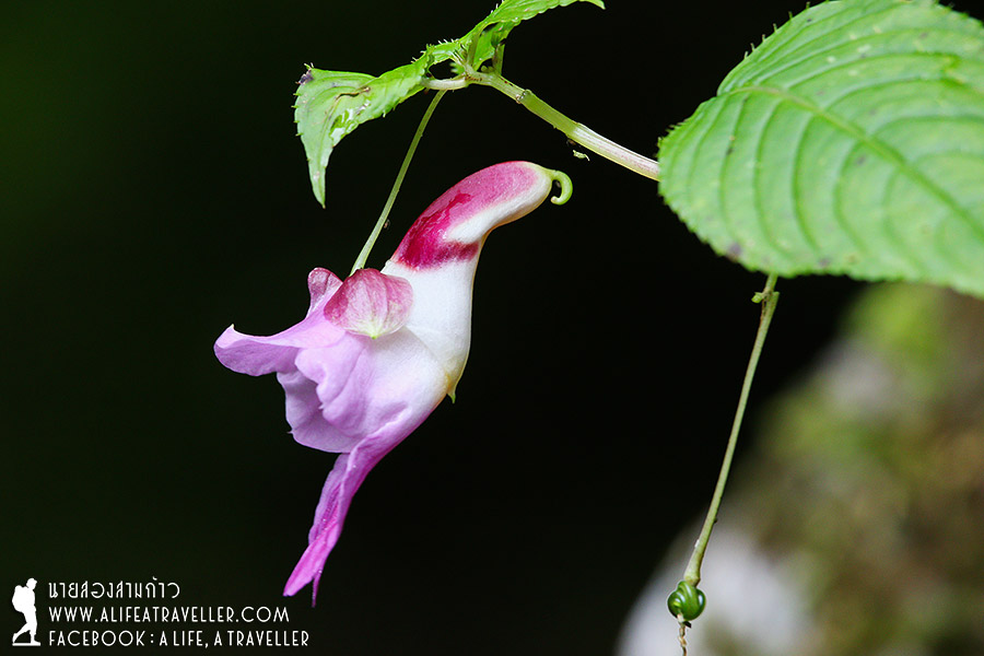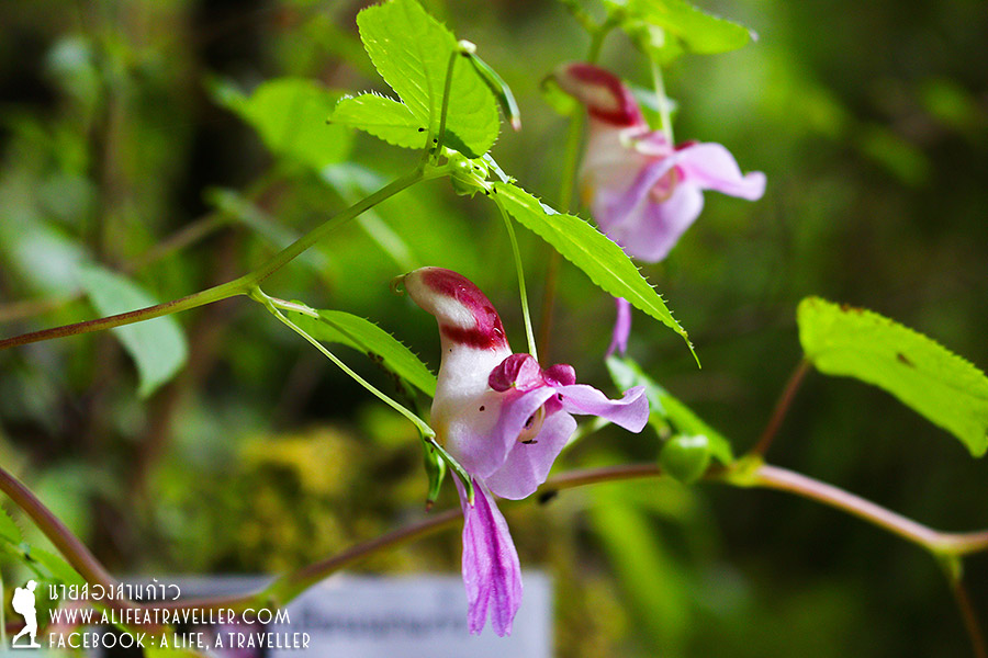 ล้อหมุนอีกครั้งแปดโมงครึ่ง คราวนี้มุ่งหน้าสู่หน่วยพิทักษ์ฯ ขุนห้วยแม่กอก หรือที่เราคุ้นเรียกกันว่าเด่นหญ้าขัด เป็นหนึ่งในสองเส้นทางเดินขึ้นดอยหลวงเชียงดาว ถนนลูกรังค่อนข้างสมบุกสมบันทีเดียว ใช้เวลาจากที่ทำการเขตฯ เกือบสองชั่วโมง จุดนี้เราจะต้องเดินยาว 8.5 กิโลเมตร ไกลกว่าขึ้นทางปางวัว 2 กิโลเมตร แต่ง่ายกว่า ไม่ชันเท่าไหร่ เพราะความสูงที่เด่นหญ้าขัดก็ราว 1,450 เมตร ขณะที่ปางวัวแค่ 1,150 เมตร ทิวทัศน์สวยกว่า และแม้จะเป็นวันกลางสัปดาห์แต่นักท่องเที่ยวพอสมควร เราจัดการข้าวของสัมภาระแล้วก็ลุยโลด ก่อนออกตัวผมไม่ลืมแจ้งคอนเซ็ปต์การเดินกับเพื่อนใหม่ “ขึ้นกลุ่มแรกถึงกลุ่มสุดท้าย” เพราะว่าสมาชิกสายพักสายแช่เราเยอะ (ฮา...) ที่เขาว่าเด่นหญ้าขัดเดินสบายก็เห็นจะจริงดังว่า อากาศสดชื่น ฝนพรำเป็นระยะ วิวสองข้างทางเขียวชอุ่ม หลังจากเที่ยวป่าหน้าฝนมาต่อเนื่องหลายเดือน ยอมรับเลยว่าผมเปลี่ยนรสนิยมมาหลงรักฟ้าขาวหมอกบางมากกว่าตอนฟ้าแจ่มแดดจัดเสียแล้วล่ะ เดินเรื่อยๆ เมื่อยก็หยุดพัก แวะกินข้าวที่พกขึ้นมากันด้วย จนมาเจอนางเอกแห่งดอยหลวงเชียงดาว ดอกเทียนนกแก้ว ไม้ประจำถิ่น ออกดอกสวยสั้นๆ ช่วงปลายฝนต้นหนาวเท่านั้น หากมองดูด้านข้างจะคล้ายนกกางปีกครับ ขณะที่ดอกไม่อื่นๆ ก็มีให้ชมเยอะแยะ บ่ายโมงเศษๆ เรามาถึงสามแยก เป็นจุดพบกันของทางปางวัวกับเด่นหญ้าขัด ถือว่าเป็นจุดครึ่งทาง จากนี้ไปมีทางเดินเดียวซึ่งชันขึ้นเรื่อยๆ สำหรับพวกเราที่ขึ้นทางเดินหญ้าขัด ส่วนคนขึ้นทางปางวัวน่ะผ่านความชันมาจนชาชินแล้ว (ฮา...) ทางชันขึ้นจริงๆ ครับ โดยเฉพาะช่วงสุดท้ายก่อนถึงลานกางเต็นท์ แต่ไม่ถึงกับหนักมาก พวกเราผ่านมาได้สะดวกโยธิน เดินไป พักไป ถ่ายรูป คุยเฮฮากันไป มีคนเดินผ่านเราไปทีละสองคนสามคน คงคอนเซ็ปต์ขึ้นกลุ่มแรกถึงกลุ่มหลังสุดไว้อย่างเหนียวแน่น ในที่สุด 16.45 น. นับจากถ่ายรูปที่ป้าย 10.50 น. เราก็มาถึงที่หมาย ลานกางเต็นท์อ่างสลุง ความสูงประมาณ 2,050 เมตร ถือว่าทำเวลาได้ดีพอตัวสำหรับสาย (นั่ง) แช่อย่างเรา ที่ว่างกางเต็นท์กระจัดกระจายอยู่หลายจุด ทั้งลานกว้าง ลานเล็กๆ หรือตามแนวป่า สำหรับกลุ่มเราลูกหาบมาจองที่เหมาะๆ ไว้ให้เรียบร้อย พอคนมาครบก็ช่วยกันจัดการต่อจนได้บ้านของพวกเราในสองคืนนี้