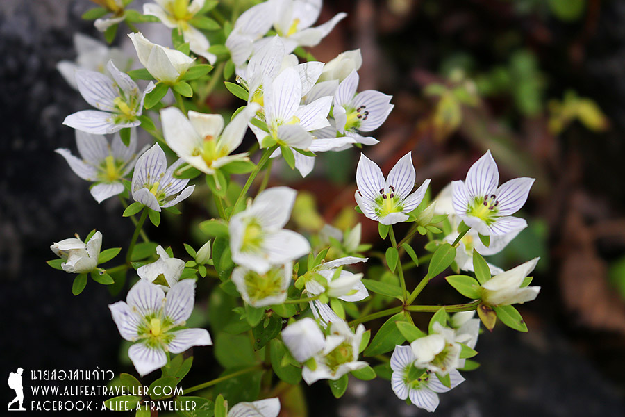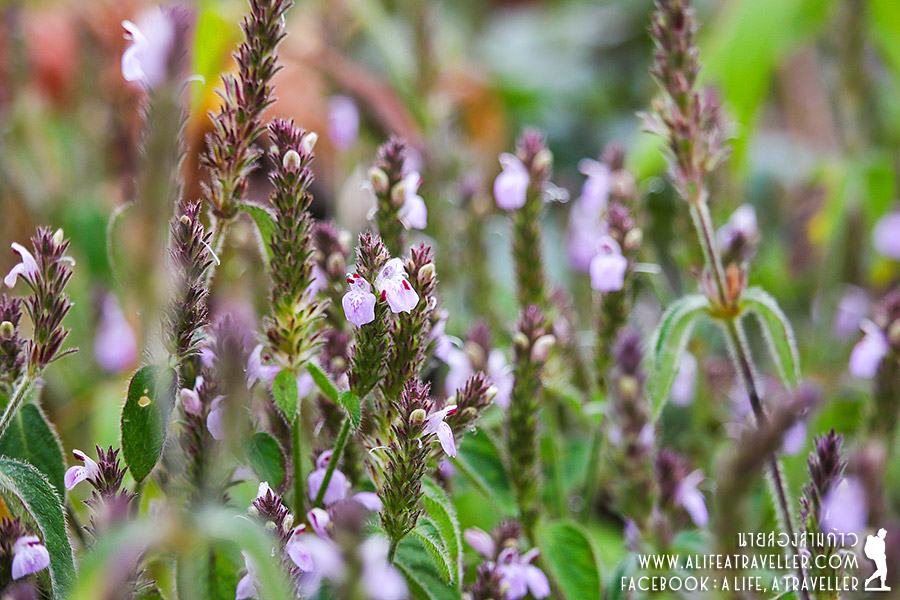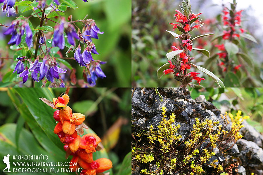 เรากินขนมปัง หมูหยอง แยม นม ข้าวที่เหลือจากเมื่อวานรองท้อง ตกลงว่าเป็นตายอย่างไรวันนี้ก็จะต้องเดินเที่ยวให้ได้ มีจุดชมวิวสองแห่งใหญ่คือยอดดอยหลวง กับยอดกิ่วลม ในครึ่งวันเช้าเราเลือกไปกิ่วลมก่อนครับ ช่วงแรกเป็นทุ่งหญ้าเนินเขา ก่อนจะตัดเข้าแนวป่าเป็นทางชันขึ้นเขา ทางลื่นสุดๆ จากฝนตกกระหน่ำ ทุลักทุเลพอประมาณ ผมเดินตามหลังเพื่อนๆ นิดหน่อยเพราะใช้เวลาอยู่กับสิ่งเหล่านี้ครับ สดชื่นเหลือเกิน เมื่อขึ้นมาถึงสันกิ่วจะมีทางแยกไปยอดกิ่วลมเหนือกับยอดกิ่วลมใต้ เราไปทางเหนือกันก่อน เดินขึ้นมาเรื่อยๆ ท้องฟ้าเริ่มดูดีขึ้นแฮะ เปิดๆ ปิดๆ หมอกลอยไปลอยมาสดชื่นสุดๆ จริงเชียว นอกจากสายหมอก ที่นี่มีดอกไม้ป่าสวยๆ มากมายครับ เราเจอตลอดทางตั้งแต่เด่นหญ้าขัดจนมาถึงอ่างสลุง แต่โดยเฉพาะที่กิ่วลมเหนือนี่สวยจริงๆ ถ่ายรูปกันเพลินเชียว ยอดกิ่วลมต่ำกว่ายอดดอยหลวงไม่เท่าไหร่หรอกครับ มองจากจุดนี้เห็นยอดดอยหลวง กับลานกางเต็นท์อ่างสลุงอยู่ตรงเชิงดอย มีเต็นท์ของเรา ห้องน้ำ พออยู่สูงขนาดนี้เห็นหมดทุกอย่างแหละครับ (ฮา...)