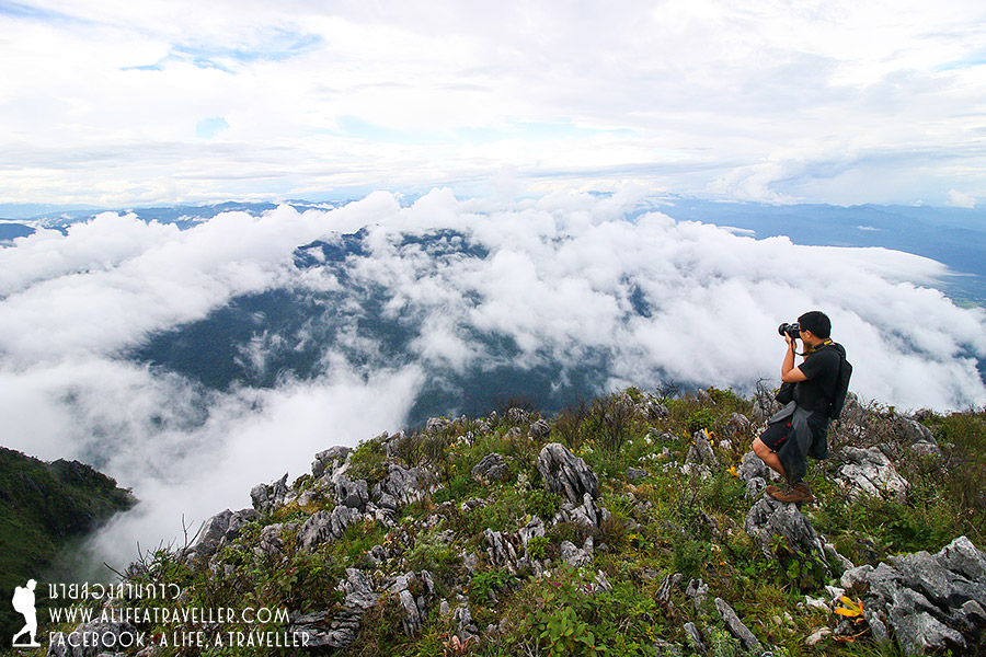 ประมาณ 45 นาที เราก็มาถึงในที่สุด ผู้พิชิตดอยหลวงเชียงดาว 2,225 เมตร สูงที่สุดอันดับสามของบ้านเรา ถ่ายรูปเล่นไม่กี่อึดใจเท่านั้นแหละ สายตาผมพลันเหลือบไปอีกมุมเห็น... ฟ้าเปิด โอ้... ไม่รู้จะอุทานเป็นภาษาอะไรดี หมอกฟุ้งกระจายขาวโพลนหายไปกลายเป็นทะเลหมอก (ฝน) งามหมดจดปานเรายืนอยู่บนสวรรค์ จะรออะไรล่ะครับ ลั่นชัตเตอร์เข้าไปสิ มุมนั้นก็สวย มุมนี้ก็งาม มุมนั้นก็สุดยอด ไม่รู้จะอธิบายยังไงจริงๆ ให้ภาพถ่ายอธิบายแทนแล้วกัน (ฮา...)