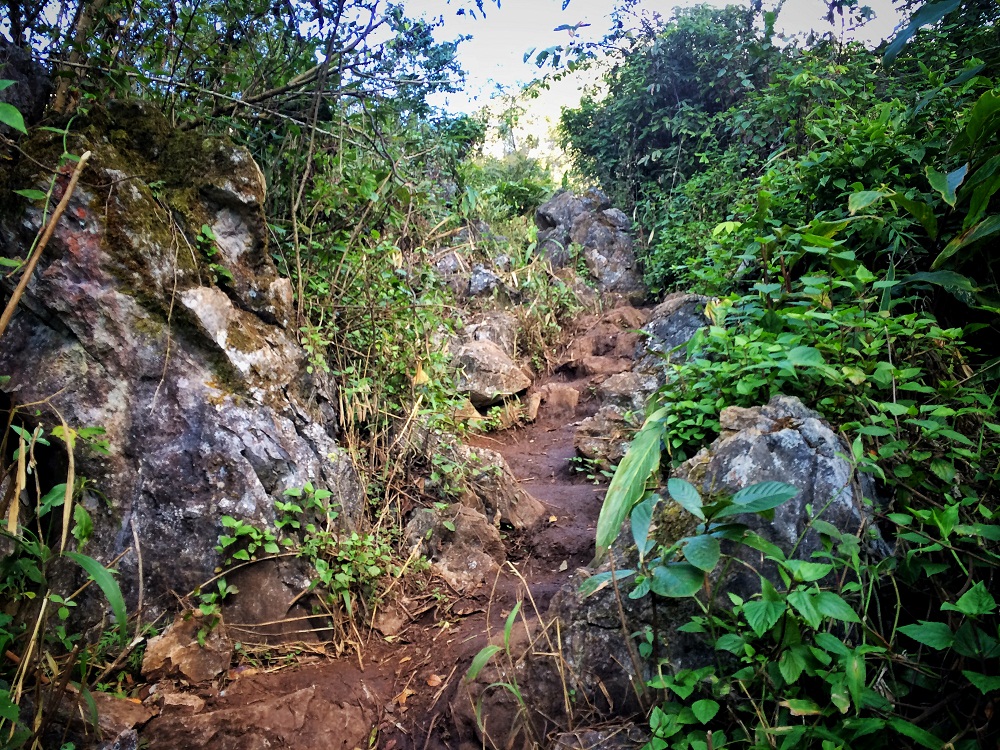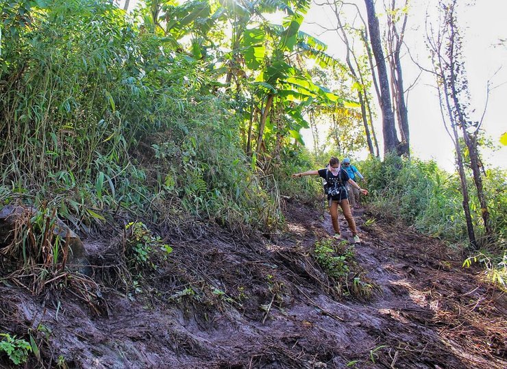 เราเดินทางผ่านป่าทึบบ้าง ผ่านทั้งต้นไม้น้อยใหญ่ ผ่านดงต้นกล้วย ผ่านทางราบ ทางชัน จนเดินมาถึงตรงนี้ทางค่อนข้างลื่น อาจเดาได้ว่าคืนที่ผ่านมาฝนคงกระหน่ำลงมาไม่ใช่น้อย ทำให้ต้องค่อยๆ เดินและประคองตัวเองให้ทรงตัวให้ดีกับสัมภาระที่แบกอยู่ข้างหลัง