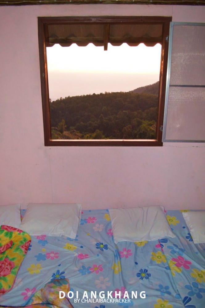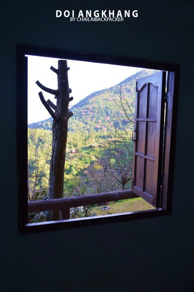 ลองเปิดหน้าต่างห้องนอนดูครับ อากาศเย็นวูบเข้ามาเลยทีเดียว บนนี้อากาศดีมากๆ เลยนะ .. เนื่องจากอยู่ที่สูง อากาศสดชื่นดี .. ครับ  มองออกไป เบื้องหน้าเป็นไร่สตรอเบอร์รี่ และทิวเขา ต้นไม้บนเขา ก็จะเห็นต้นนางพญาเสือโคร่งขึ้นแทรก แซมเป็นสีชมพู เหมือนแต้มสีไว้อยู่บนภูเขาด้วย