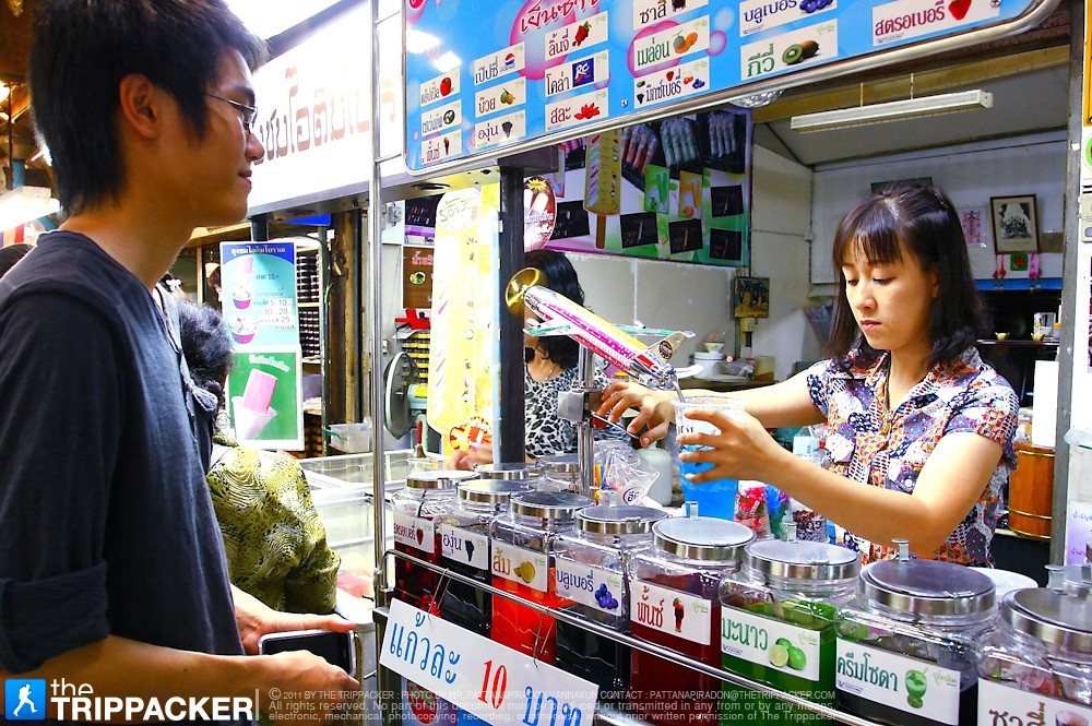The following restaurants and dessert shops are just a few of the popular places to eat during your trip. Listing everything out is nearly impossible since there is so much to see and eat. If you like duck, stop by at Ped Palo Nai Nub – Nai Nub Stewed Duck for lunch. This restaurant has been open long before the floating market became a tourist destination. On your plate of hot rice, you are given big chunks of soft and tender stewed duck. The dipping sauce that comes with it has a really sour taste mixed with spiciness. Another dish you can try is the duck stewed in pickled lemon; Ped Toon Manow Dong.