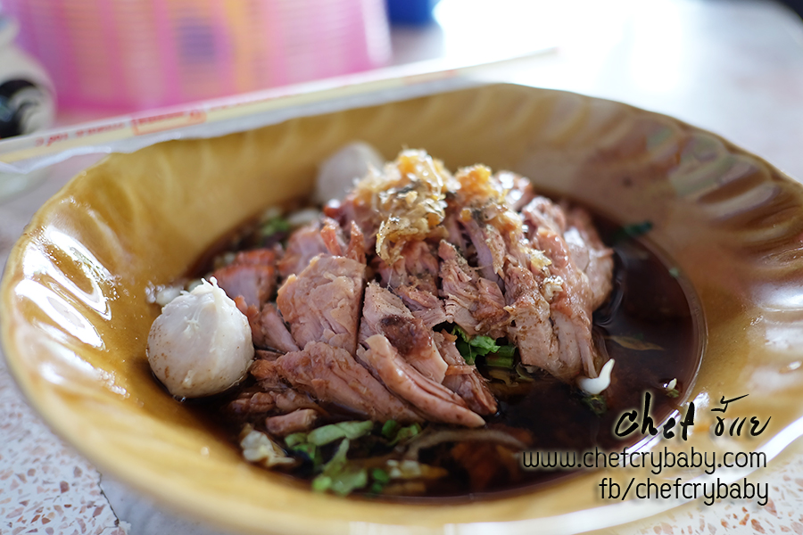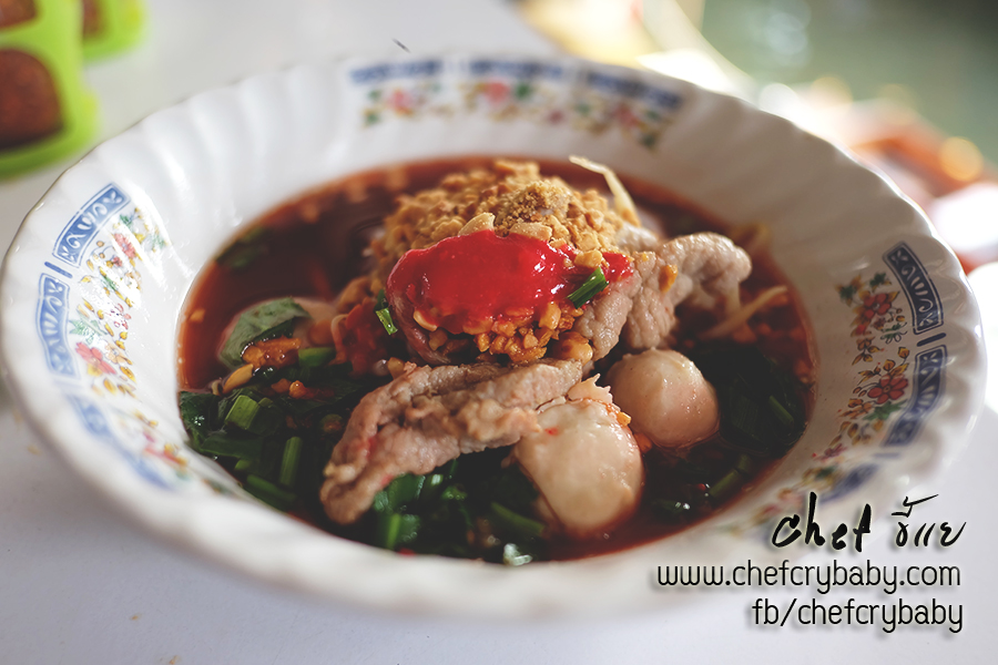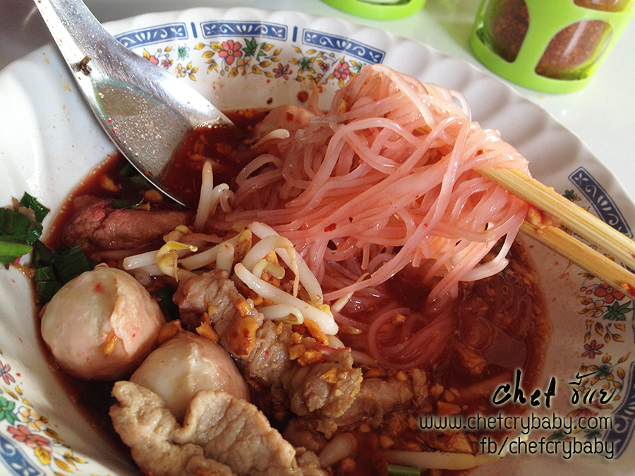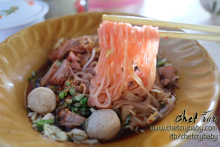 เส้นเล็กหมูน้ำแดง - สรุปว่าอร่อยจนเจ้านนท์ชวนเบิ้ลเลย ไอ้เราก็ติดลมอยู่พอดี ฟากโน้นเค้าเบิ้ลเมนูเดิม แต่ผมขอลองไปเรื่อยสไตล์ผม... ก็เลยขอเลือกเมนูนี้ เฮียแกบอกว่าเลือกได้ดีมาก เพราะเมนูนี้เป็นเมนูประจำของ จุ๋ย วรัทยา เลย!!!! ตอนมาถ่ายละครที่นี่ เฮียแกบอกว่า สั่งอยู่เมนูเดียวทุกวันไม่มีเปลี่ยนใจ (แหม... ทานเมนูเดียวกับ จุ๋ย จะได้แฟนสวยเหมือนจุ๋ยมั้ยเนี่ย)