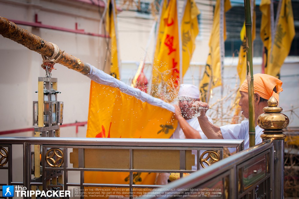 ประเพณีถือศีลกินผักของชาวภูเก็ตจะขาดเสน่ห์และถือว่าไม่สมบูรณ์แบบตามขนบหากขาดพิธีการที่สำคัญอย่างพิธีการ “ยกเสาโกเต้ง” หรือยกเสาเทวดา ในเย็นวันแรกก่อนเริ่มเทศกาล ศาลเจ้าต่างๆ จะทำพิธียกเสาไม้ไผ่โดยบนยอดเสาจะมีตะเกียง 9 ดวง เพื่อบูชาเทพเจ้าทั้ง 9 องค์ และต้องจุดตะเกียงไฟไว้ตลอดทั้ง 9 วัน ตามความเชื่อจนกว่าพิธีจะจบสิ้น ช่วงเช้าของวันแห่จะมีขบวนม้าทรงที่เทพเจ้าเข้ามาประทับร่างเพื่อออกเยี่ยมเยียนโปรดสัตว์ไปตามบ้านเรือนท้องถนน พร้อมด้วยขบวนธงและป้ายชื่อแห่นำหน้าขบวนในลักษณะการบำเพ็ญทุกรกิริยาหลากหลายรูปแบบ มีนักท่องเที่ยวไม่น้อยที่มองพิธีการนี้ว่ารุนแรง แต่เมื่อได้สอบถามคนในท้องถิ่นเองจะได้รับคำตอบว่าเป็นการทรมานตนเองเพื่อสะเดาะเคราะห์ให้กับผู้ถือศีลกินผักตามความเชื่อว่าท่านกิ้วอ่องไต่เต่ท่านเป็นผู้รับเคราะห์ แทนทั้งนี้ม้าทรงเหล่านั้นโดยมากมาด้วยความสมัครใจบางรายก็มาด้วยความเชื่อว่าเป็นการต่อชะตาชีวิตแก่ตนเองและมีไม่น้อยเช่นกันที่เทพเจ้าเข้ามาประทับร่างโดยที่ตนไม่ได้ตั้งใจ นับเป็นอีกหนึ่งไฮไลต์ของงานที่เรียกเสียงลั่นชัตเตอร์และแสงแฟลชของนักท่องเที่ยวได้เป็นอย่างมาก