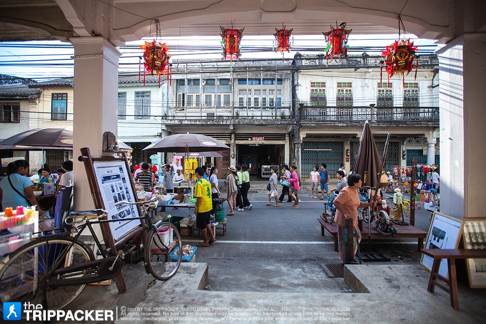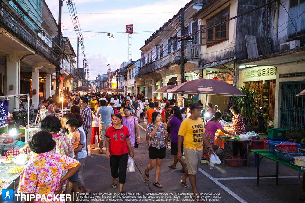 “ถนนศรีตะกั่วป่า” สถานที่ตั้งของ “ถนนคนเดินตะกั่วป่า” ในอดีตเคยเป็นถนนสายที่คึกคักที่สุดในจังหวัดพังงา นั่นเพราะ ย่านนี้มีคนจีนเข้ามาทำเหมืองแร่ดีบุกเป็นจำนวนมาก ดังนั้นเมืองจึงก่อร้างสร้างตัวขึ้น และมีความคึกคักตลอด 24 ชั่วโมง ส่วนสองฟากฝั่งถนนก็เต็มไปด้วยตึกแถวสไตล์ชิโนโปรตุกีสที่แต่ละหลังเต็มไปด้วยเอกลักษณ์จากลวดลายปูนปั้น ซุ้มประตูโค้ง ลายแกะสลักไม้ และตัวตึกสีสันสวยงาม จวบจนถึงปัจจุบันที่ยังคงเสน่ห์และมนต์ขลังไว้ในบรรยากาศแบบเก่าๆ ไม่เสื่อมคลาย เมื่อหมดยุคทองของการทำเหมือง ถนนศรีตะกั่วป่าจึงเงียบเหงาลงไปถนัดตา เพราะชาวพื้นที่ต่างเก็บตัวอยู่ในบ้าน จนเมื่อไม่กี่ปีมานี้เองที่ถนนสายนี้กลับมามีชีวิตชีวาอีกครั้ง โดยเฉพาะวันอาทิตย์ที่มีถนนคนเดิน สองข้างทางจะเต็มไปด้วยร้านค้า ที่พ่อค้าแม่ขายต่างก็ยิ้มแย้มทักทายลูกค้า และตักนู้นหยิบนี่ให้ชิมกันก่อนตัดสินใจซื้อ แถมมิตรภาพของคนในพื้นที่อันน่ารัก เพราะคุณตา คุณยาย คุณป้า คุณอา ต่างรู้จักกันหมด เราจึงได้ยินเสียงพูดคุยทักทายกันอยู่ไม่ขาดสาย