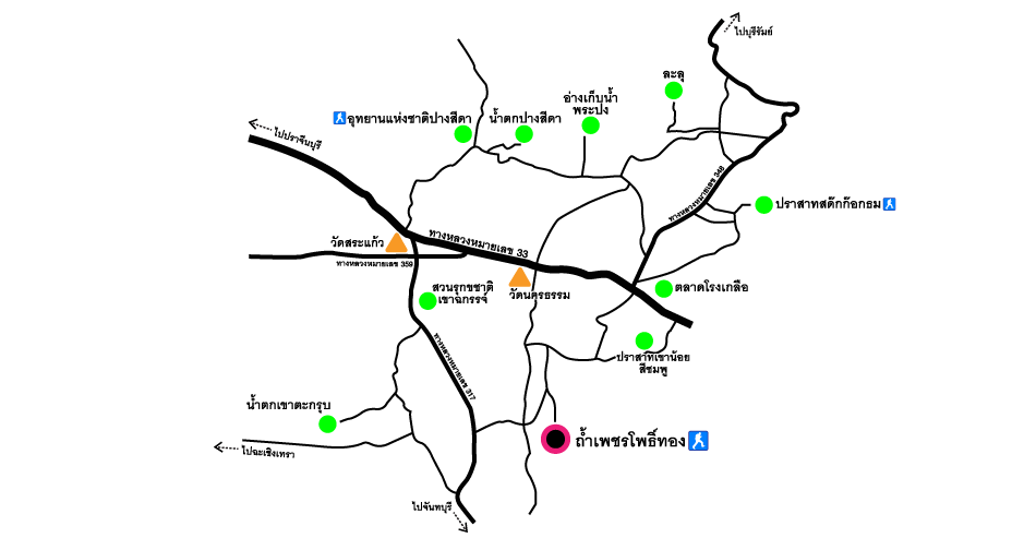 • ถ้ำเพชรโพธิ์ทอง และถ้ำเพชรหาดทรายแก้ว นับเป็นแหล่งท่องเที่ยวที่สำคัญอีกแห่งของจังหวัดสระแก้ว ซึ่งนอกจากจะได้ชื่นชมกับความสวยงามของธรรมชาติภายในถ้ำ ที่มีหินงอก หินย้อย และลวดลายบนผนังถ้ำแล้ว ยังมีกิจกรรมผจญภัยท้าความกล้า ด้วยการโรยตัวบนหน้าผาให้บรรดานักท่องเที่ยวผู้มีใจรักการผจญภัยได้ทำกันสนุกๆ นอกเหนือจากการเดินเที่ยวชมถ้ำเพียงอย่างเดียว