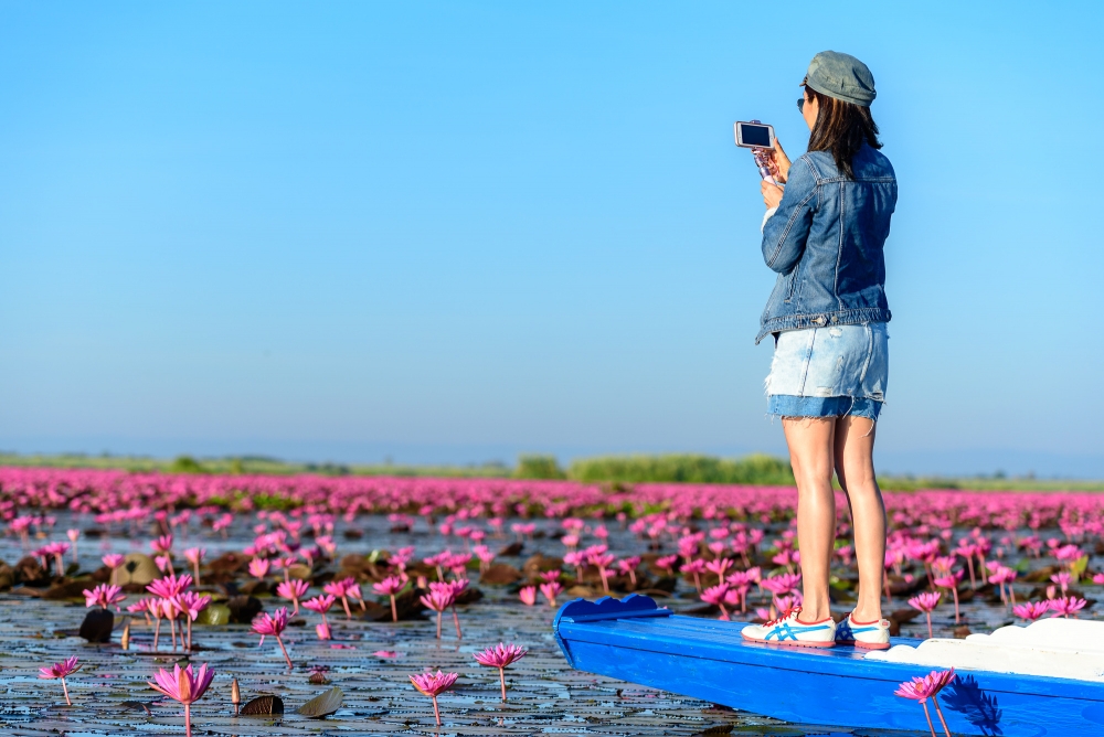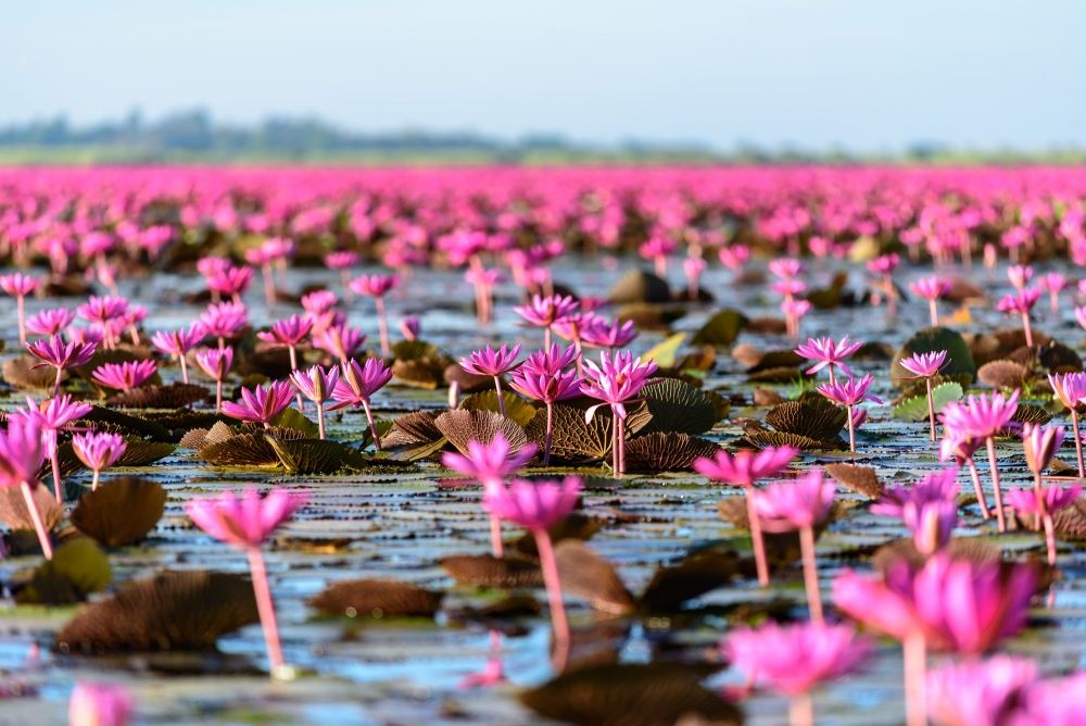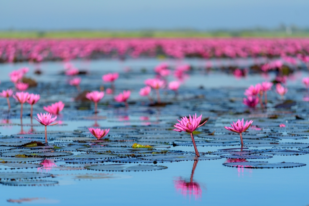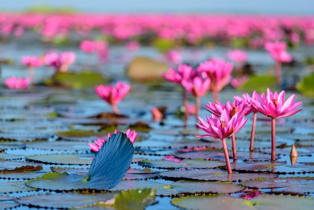 การถ่ายภาพทะเลบัวให้ดูเป็นทะเลบัวก็ต้องอาศัยเทคนิคหน่อยนะครับ คือวางระดับกล้องให้ต่ำหน่อยเพื่อให้ดอกบัวดูซ้อนกันแน่นขึ้น ... และเนื่องจากแสงช่วงเช้าจะออกโทนอุ่นทำให้ใบบัวออกเป็นสีเขียวอมเหลืองหากถ่ายภาพตามแสงจะได้ภาพของใบที่สีไม่ตัดกับสีดอกบัวสีชมพูนักนัก ลองหามุมกล้องที่แสงเข้าด้านข้างเล็กน้อยเราจะได้ภาพดอกบัวสีชมพูตัดกับน้ำในหนองหานที่เป็นสีฟ้าอมน้ำเงินสวยงามขึ้น