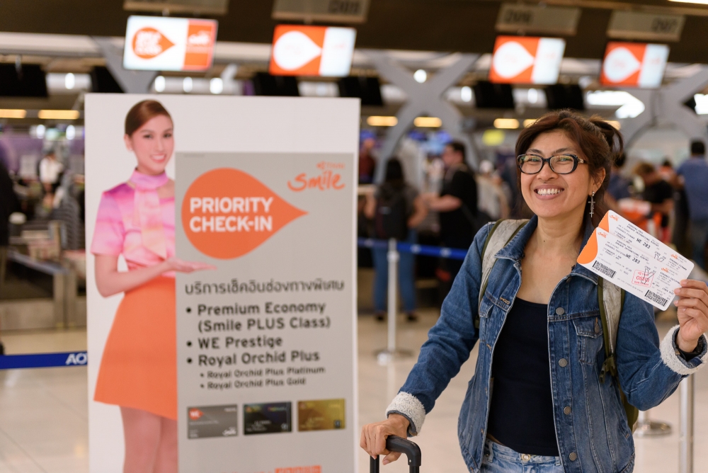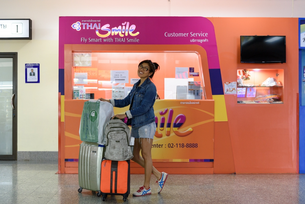 สายการบินไทยสมายล์จะสามารถโหลดกระเป๋าได้ 20 ก.ก. สำหรับชั้น Smile class และได้มากถึง 30 ก.ก. ในชั้น Smile plus ซึ่งเหมาะกับสายช้อปหรือเดินทางต่อมาจากต่างประเทศ ได้น้ำหนักกระเป๋าเยอะๆ โดยไม่ต้องเพิ่มเงินแบบนี้ก็สะดวกดีนะ ขาตั้งกล้องหนักๆ ของผมก็ใส่ไปในกระเป๋าเลยไม่ต้องขนขึ้นเครื่องให้ยุ่งยาก … ส่วนของที่นั่งก็ถือว่ากว้างดีทีเดียว