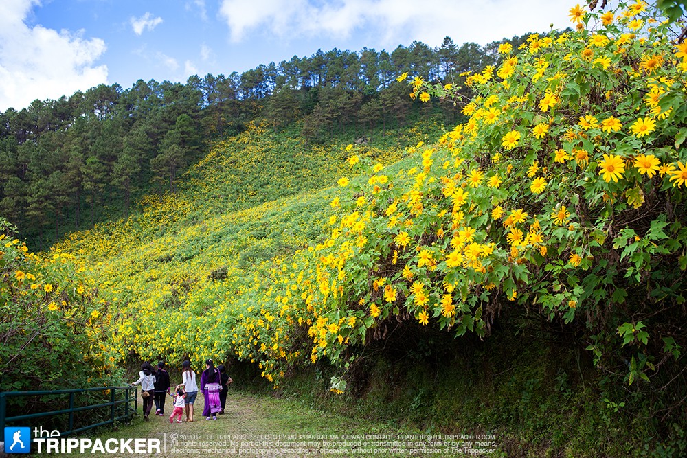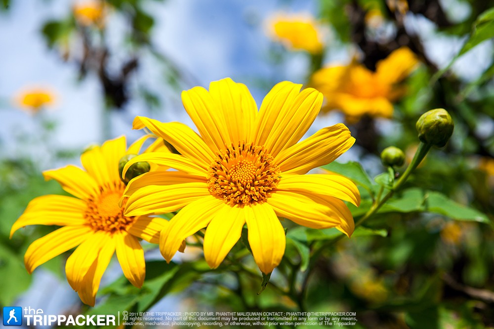 ถ้าจะบอกว่า “เทศกาลดอกบัวตองบาน” เป็นงานใหญ่ประจำปีของจังหวัดแม่ฮ่องสอนก็คงจะไม่ผิดนัก เพราะในช่วงเดือนพฤศจิกายนของทุกปี ใครๆ ต่างก็อยากแห่แหนกันมาชมความงามของดอกบัวตองกันทั้งนั้น เหมือนกันกับเราที่ตั้งตานับวันรอดอกบัวตองบาน จนต้องรีบขับรถผ่านโค้งนับพันเพื่อให้สองเท้าเหยียบย่าง ณ ถิ่นบัวตองให้จงได้ ยังไม่ทันจะถึงจุดหมายปลายทางดี ยอดดอยสีเหลืองๆ ก็เริ่มปรากฏให้เห็นตรงหน้า อีกแค่อึดใจเดียวเราก็จะได้เริงร่ากลางทุ่งบัวตองกันแล้ว ขณะที่กำลังค่อยๆ ไต่ระดับความสูงขึ้นไปบนยอดดอย เรามาทำความรู้จักกับดอกบัวตองกันซะหน่อยดีกว่า